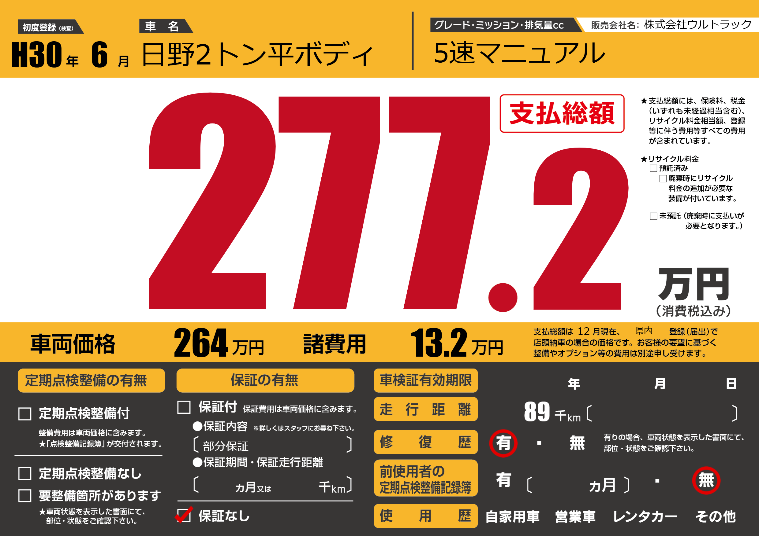 | 車名 | 日野2トン平ボディ | グレード ミッション 排気量 |