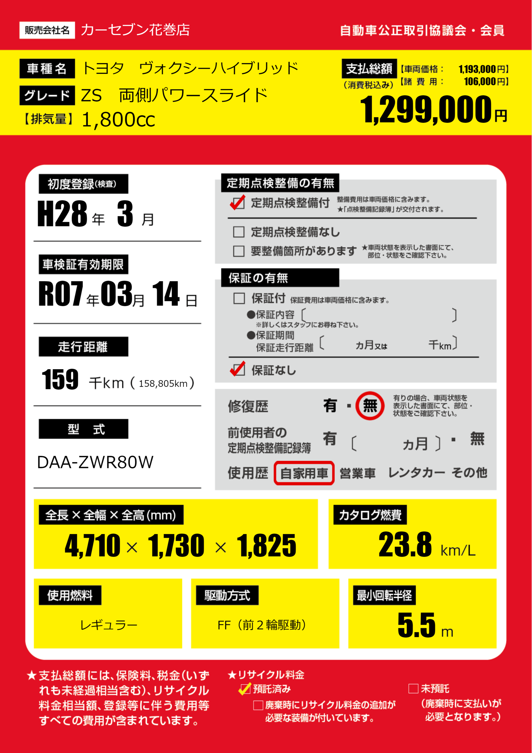 | 走行キロ | 15.9万km | 初年度登録 | H28年3月 |