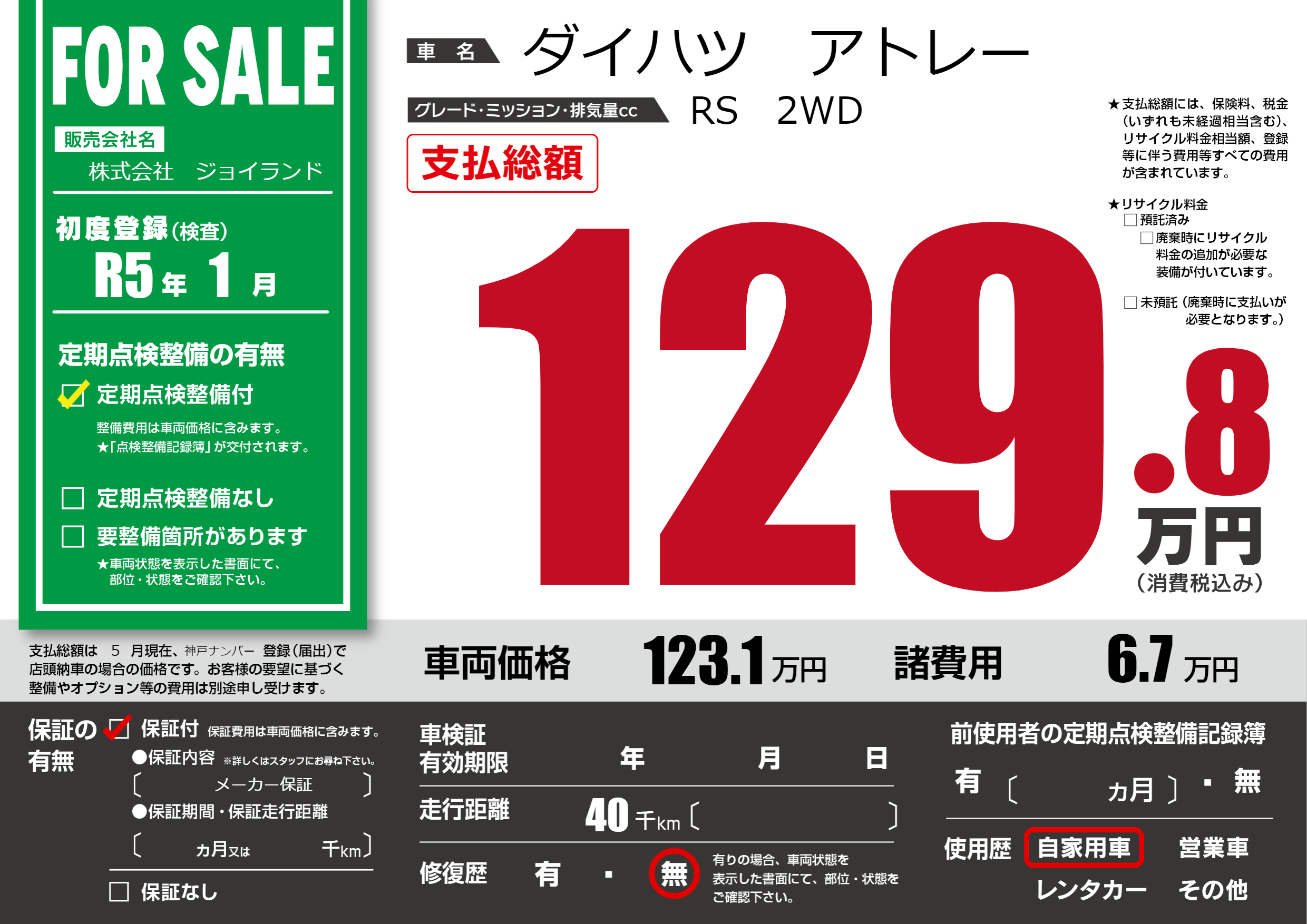 | 走行キロ | 4万km | 初年度登録 | R5年1月 |