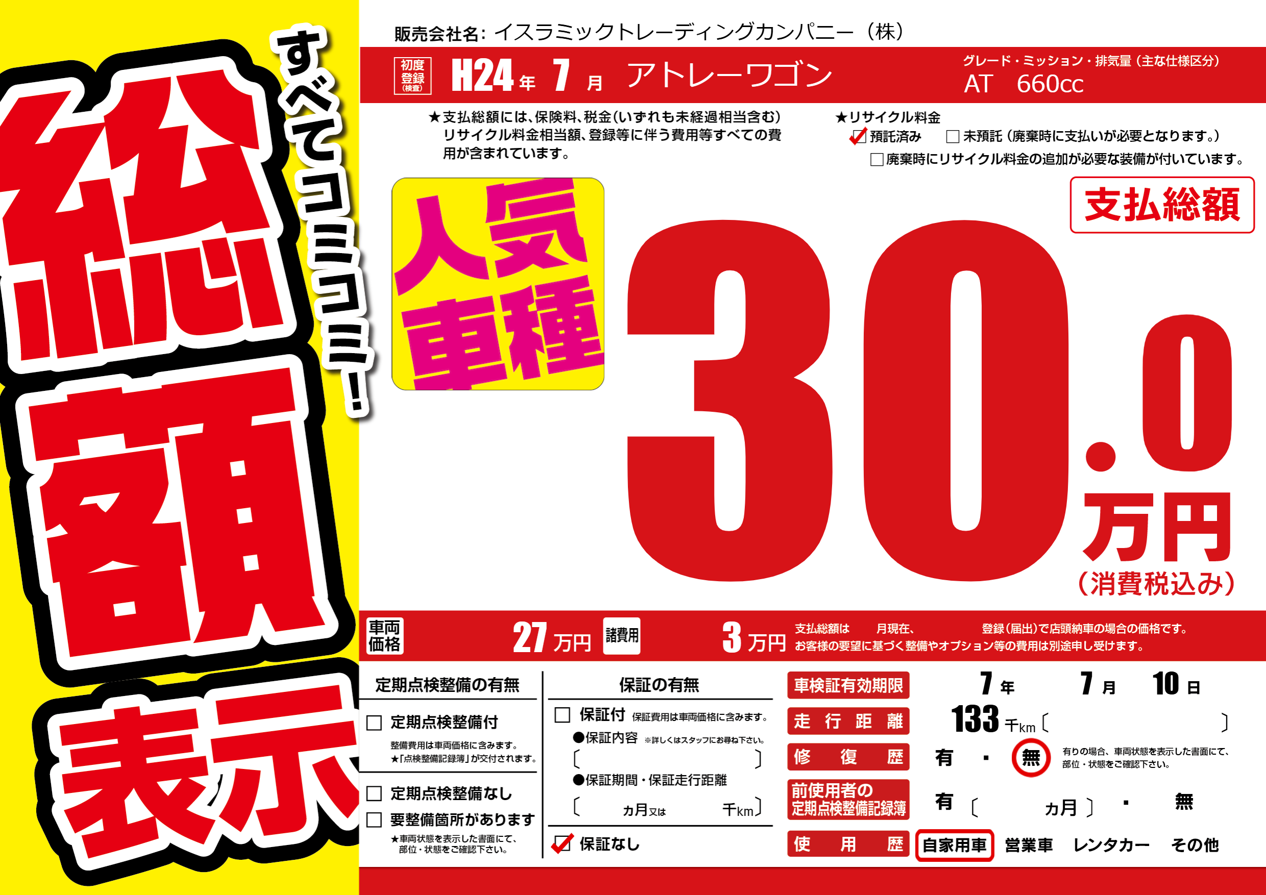 | 走行キロ | 13.3万km | 初年度登録 | H24年7月 |