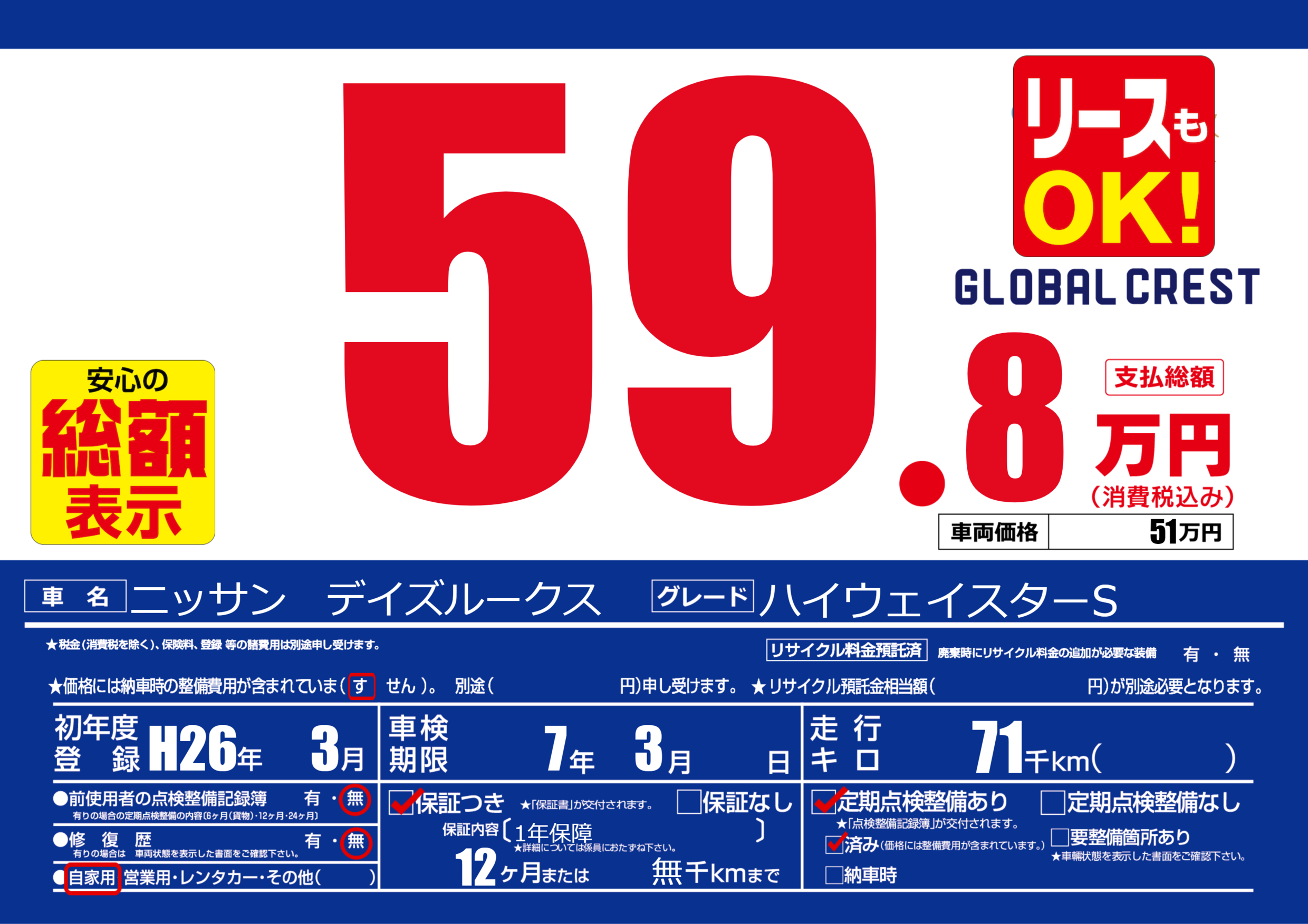 | 定期点検整備 | 定期点検整備あり 定期点検整備済み | ||