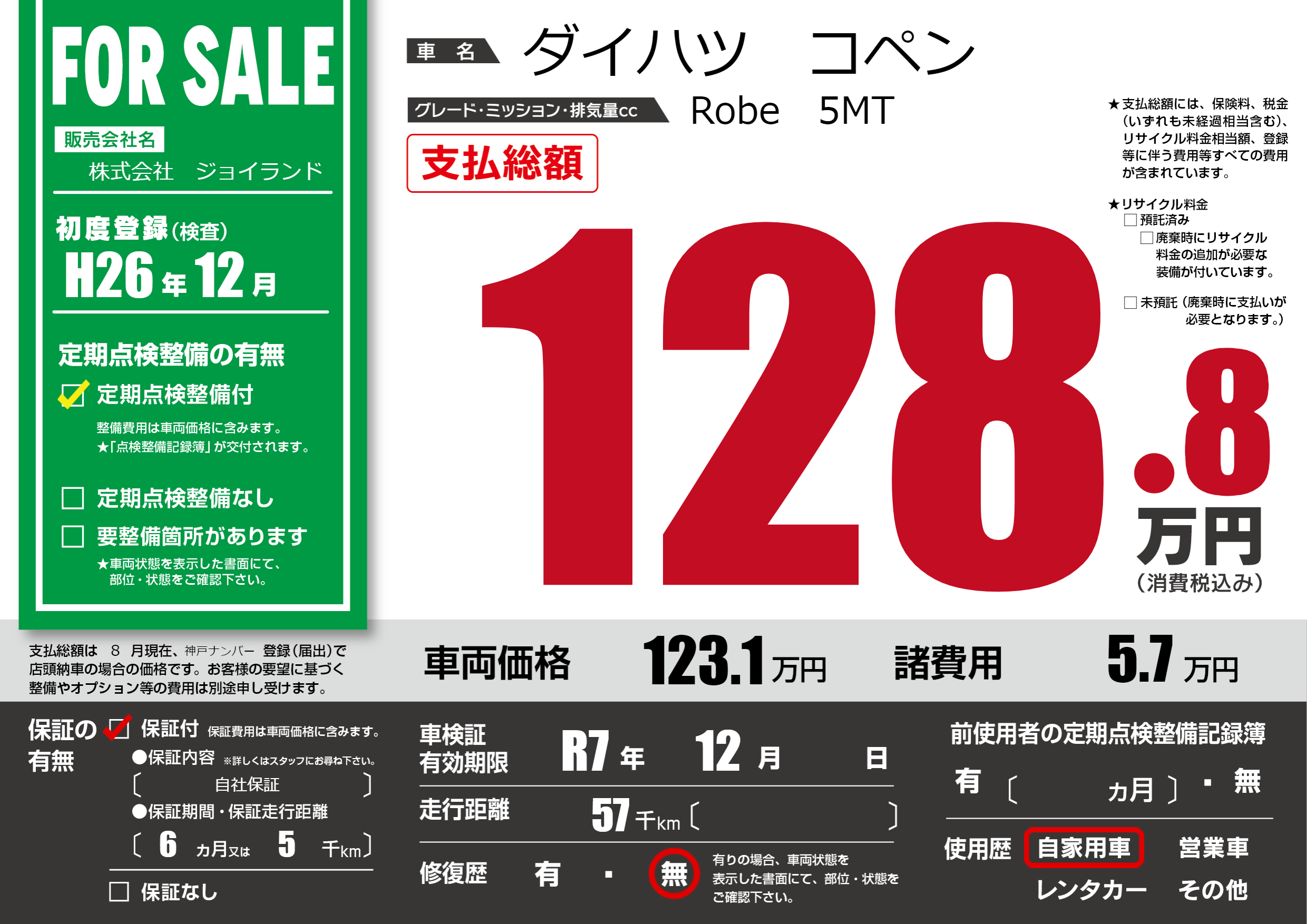 保証付き 保証内容( 自社保証) 6ヶ月または(5)千kmまで |