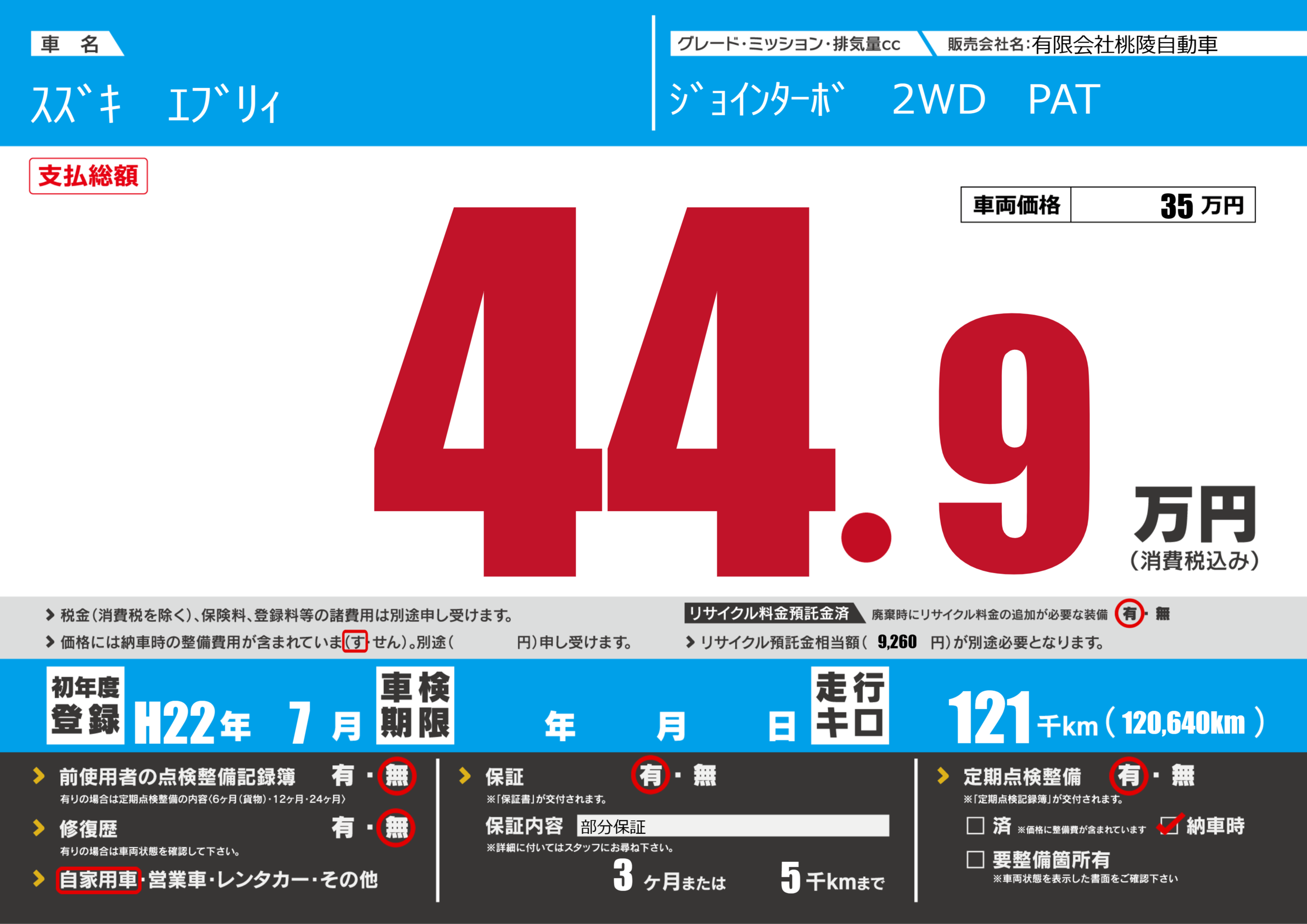保証付き 保証内容(部分保証) 3ヶ月または(5)千kmまで |