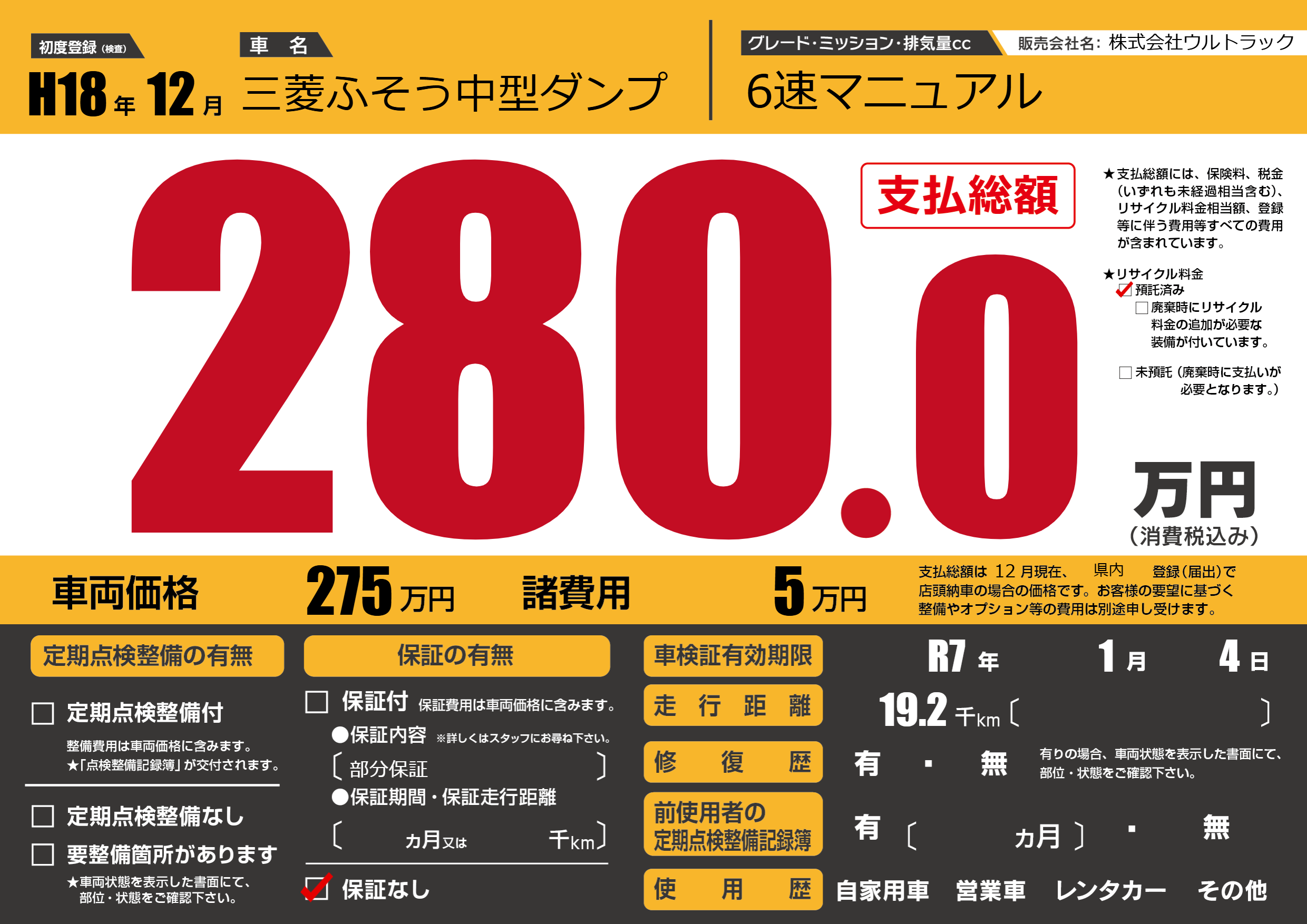 | 車名 | 三菱ふそう中型ダンプ | グレード ミッション 排気量 |