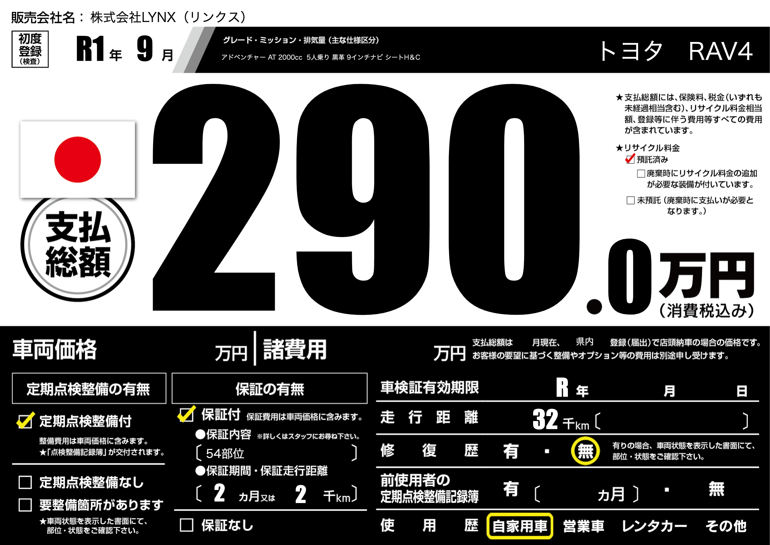 | 車名 | トヨタ RAV4 | グレード ミッション 排気量 |