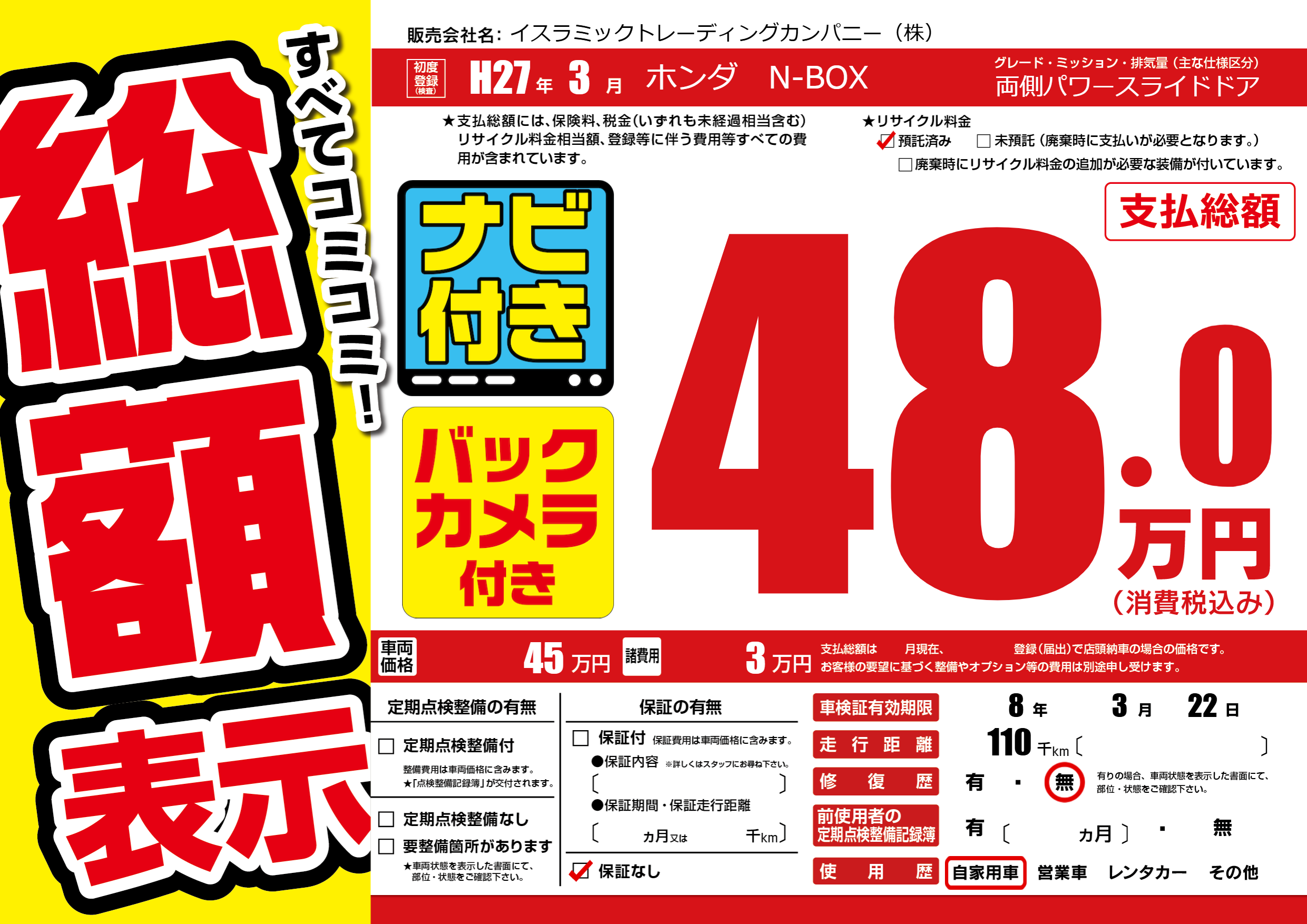 | 車名 | ホンダ N-BOX | グレード ミッション 排気量 |