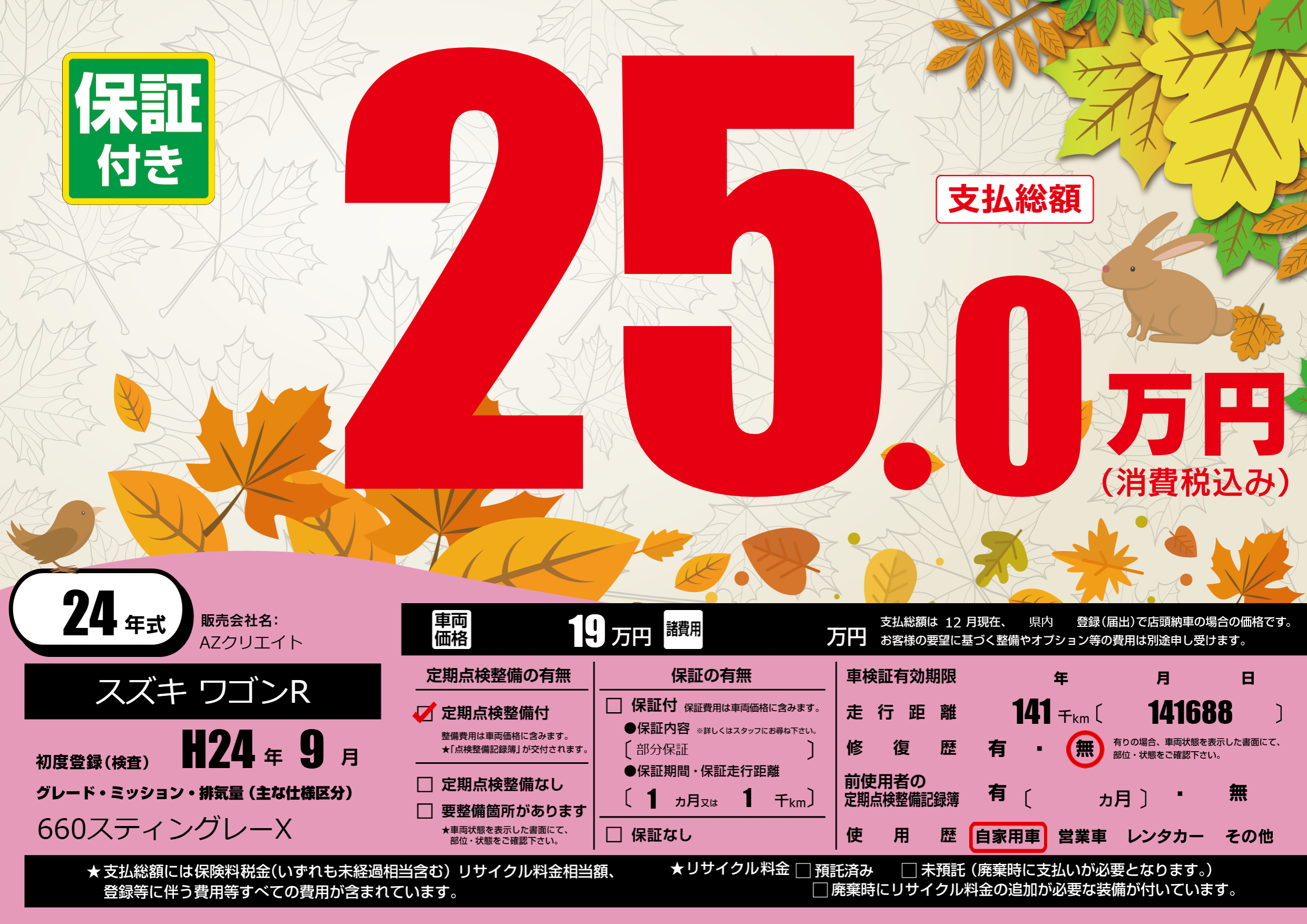 | 走行キロ | 14.1万km | 初年度登録 | H24年9月 |