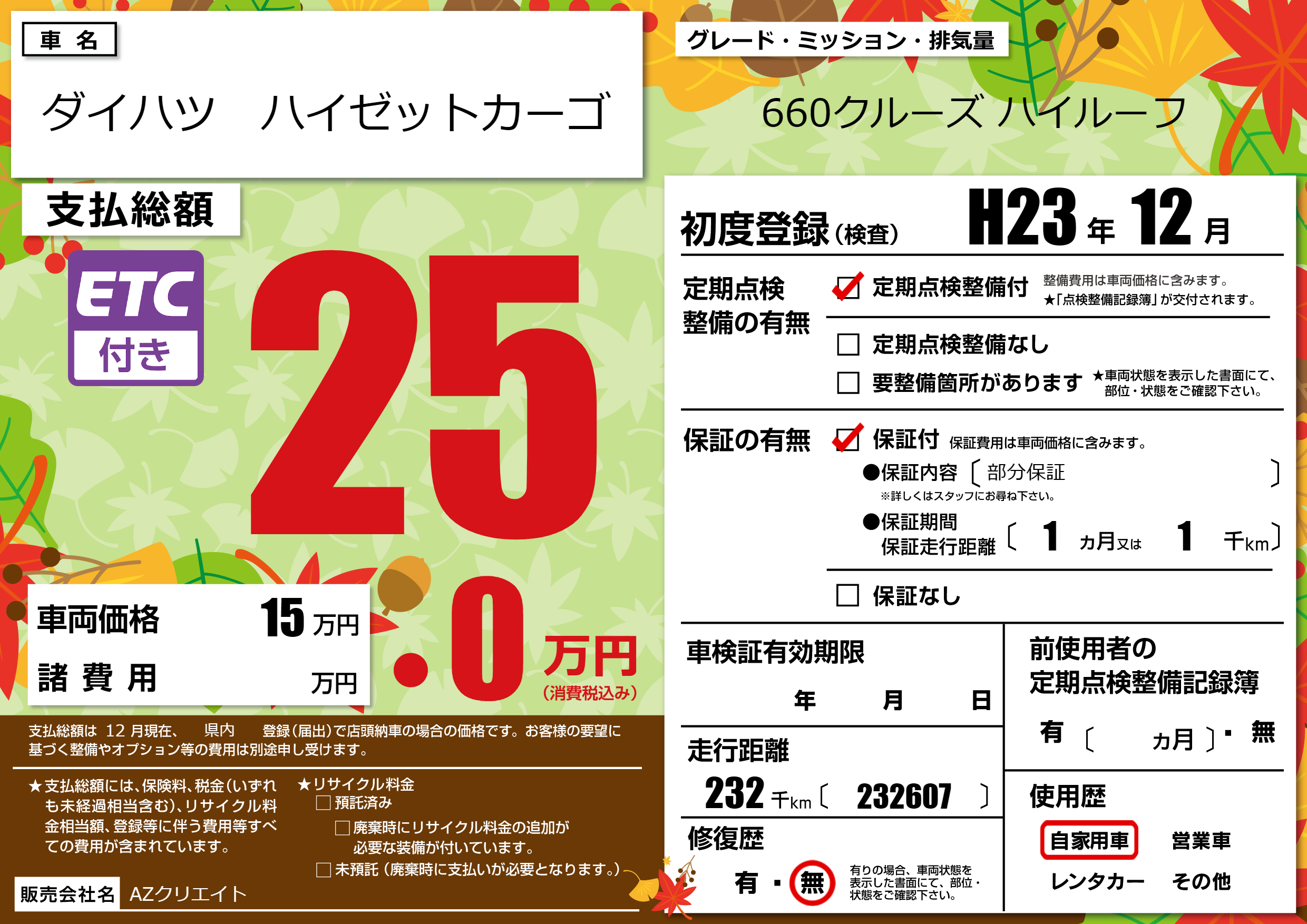 | 走行キロ | 23.2万km | 初年度登録 | H23年12月 |