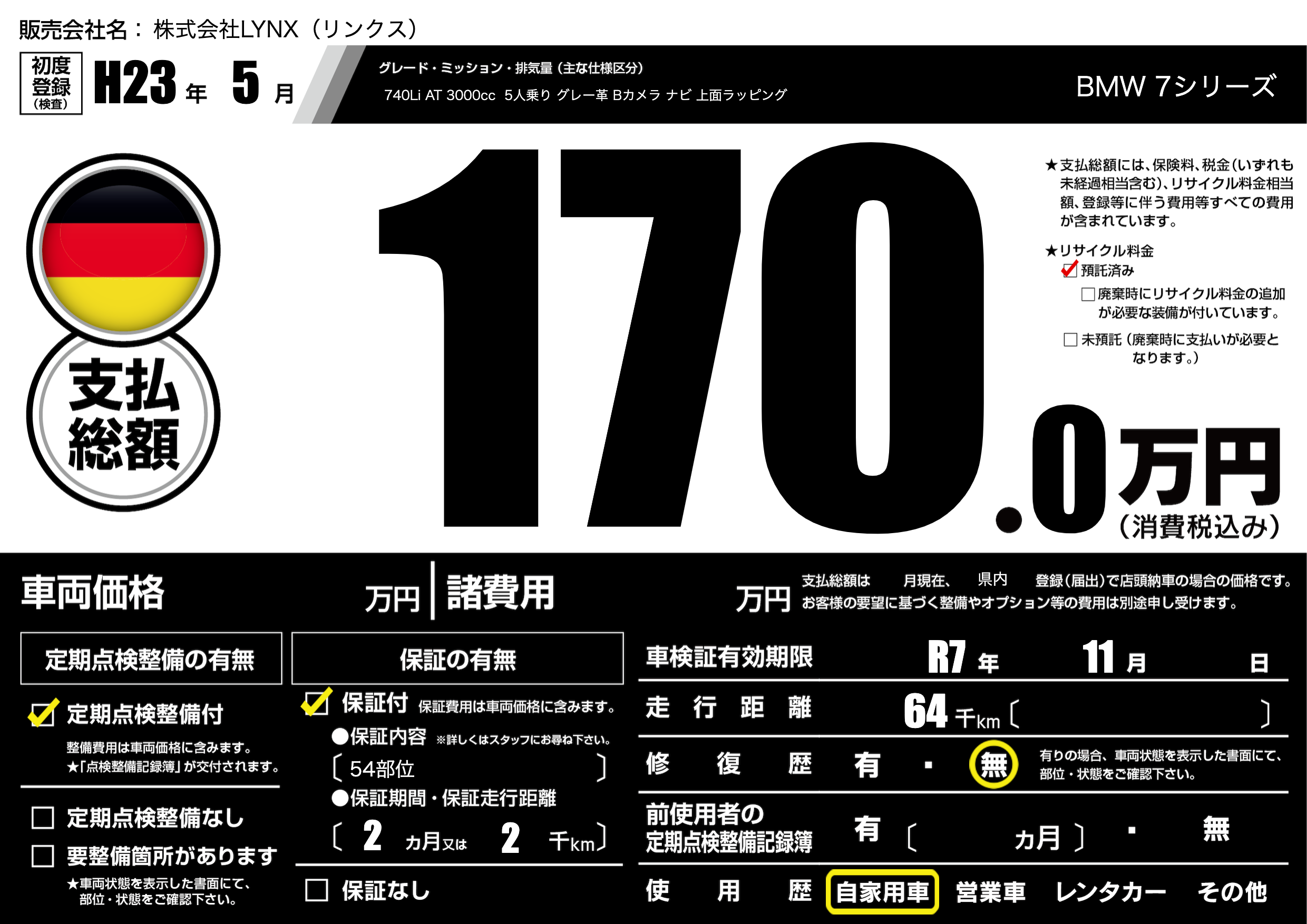 | 車検制限 | R7年 11月 - 日 | ||