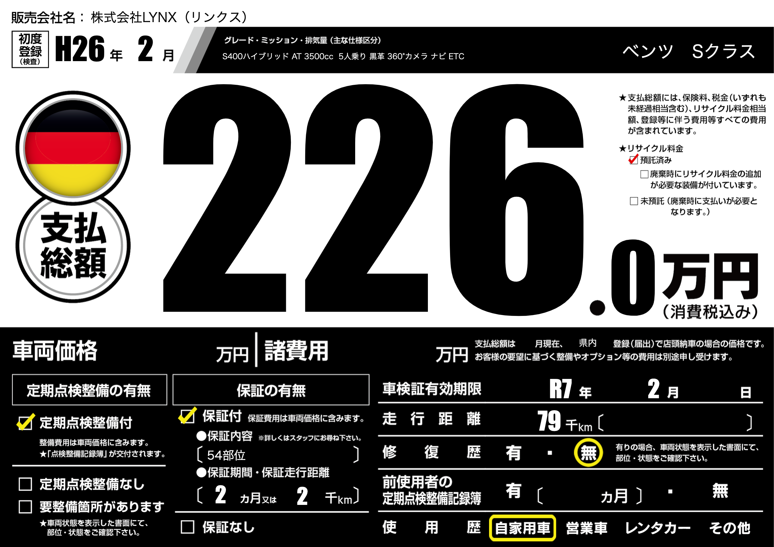 | 車名 | ベンツ Sクラス | グレード ミッション 排気量 |