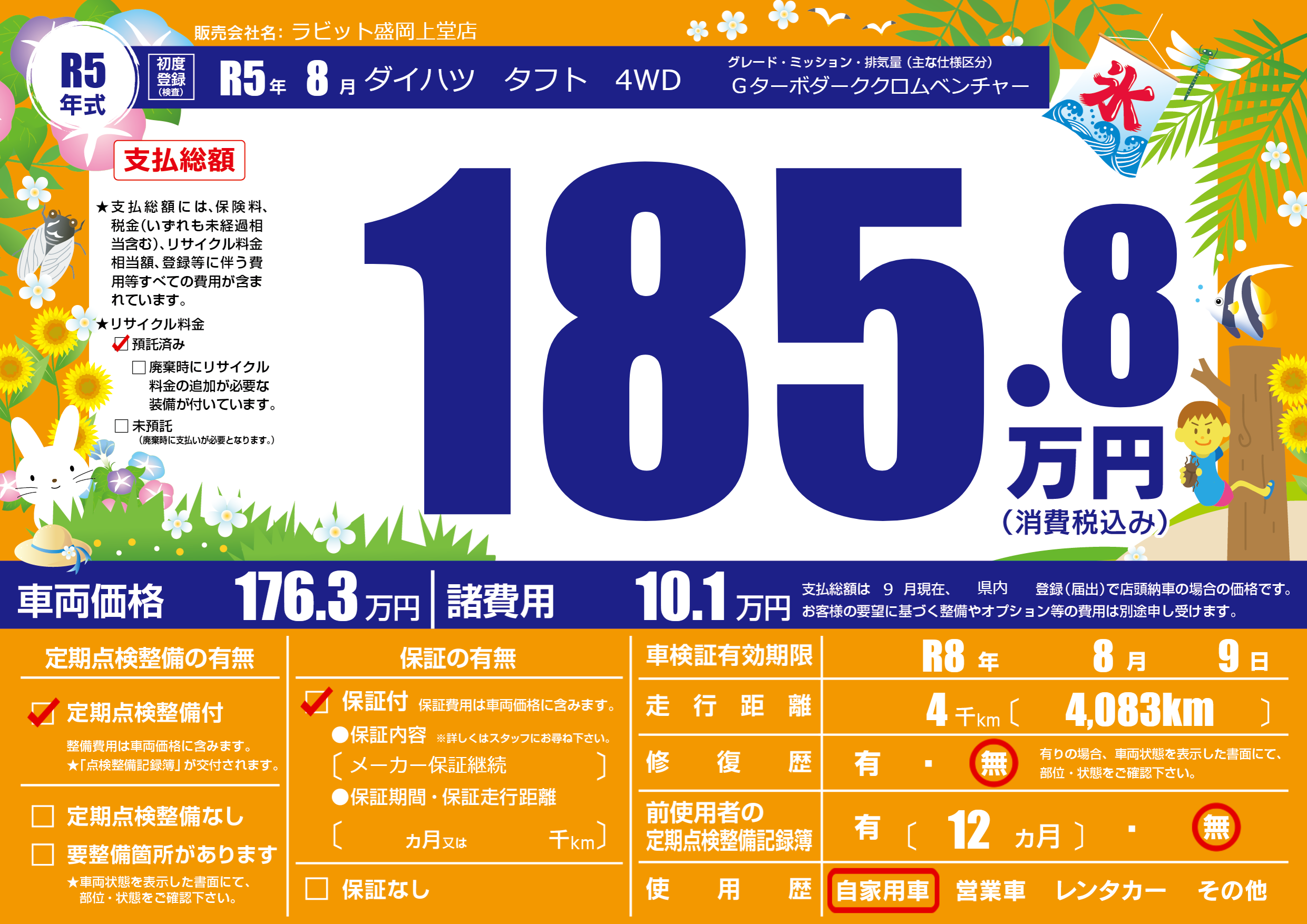 | 走行キロ | 0.4万km | 初年度登録 | R5年8月 |