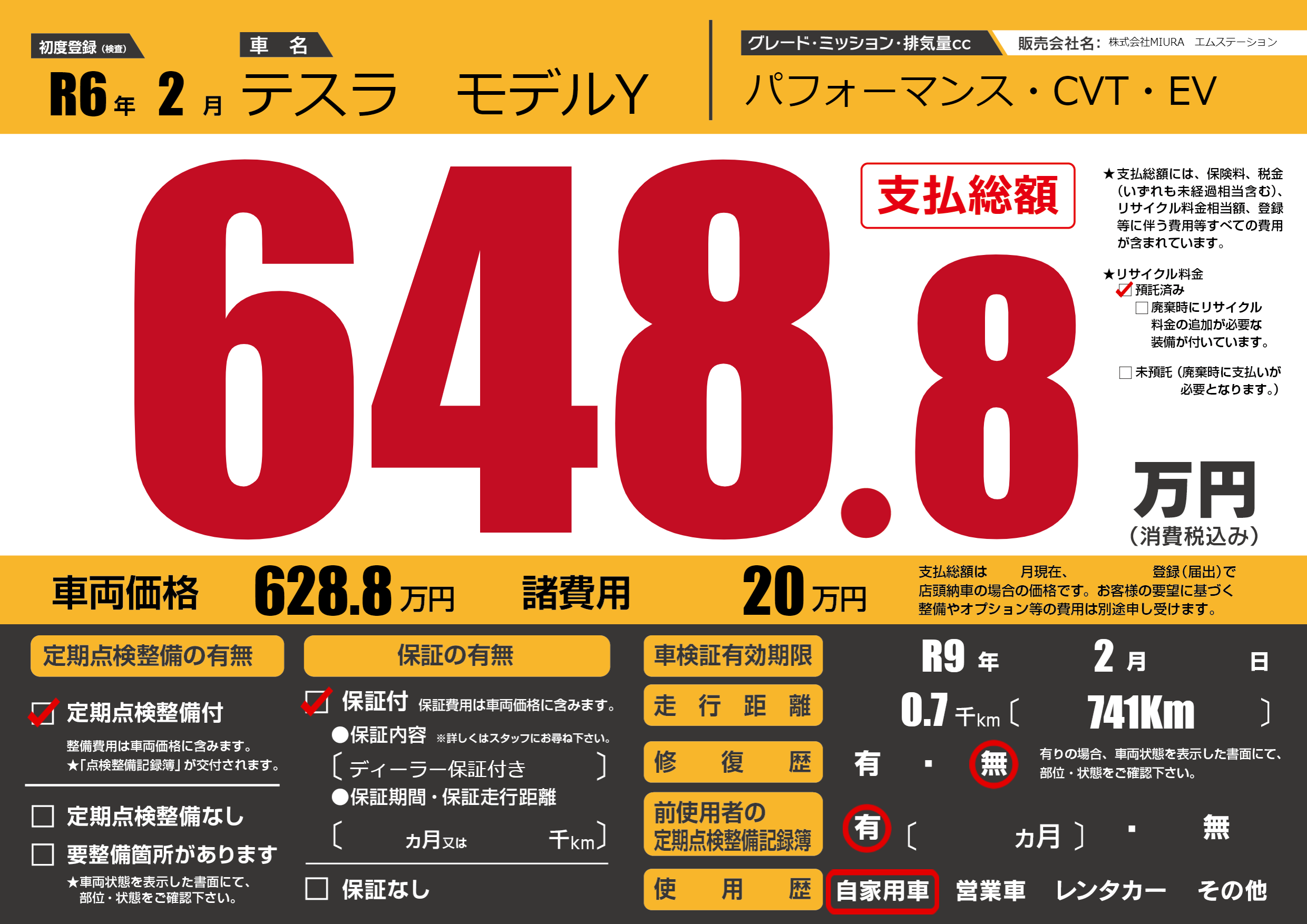 | 車名 | テスラ モデルY | グレード ミッション 排気量 |