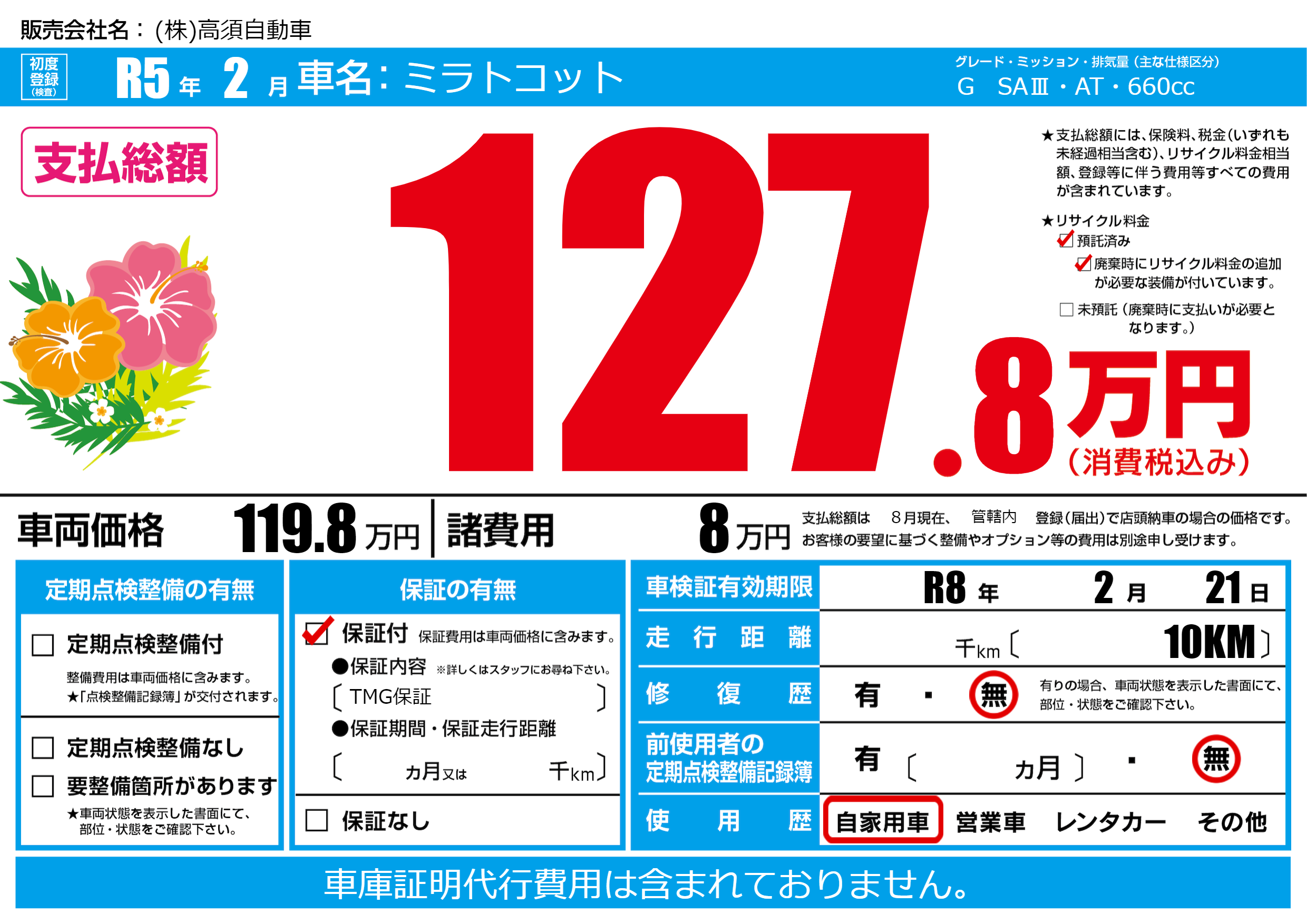 | 車名 | ミラトコット | グレード ミッション 排気量 |