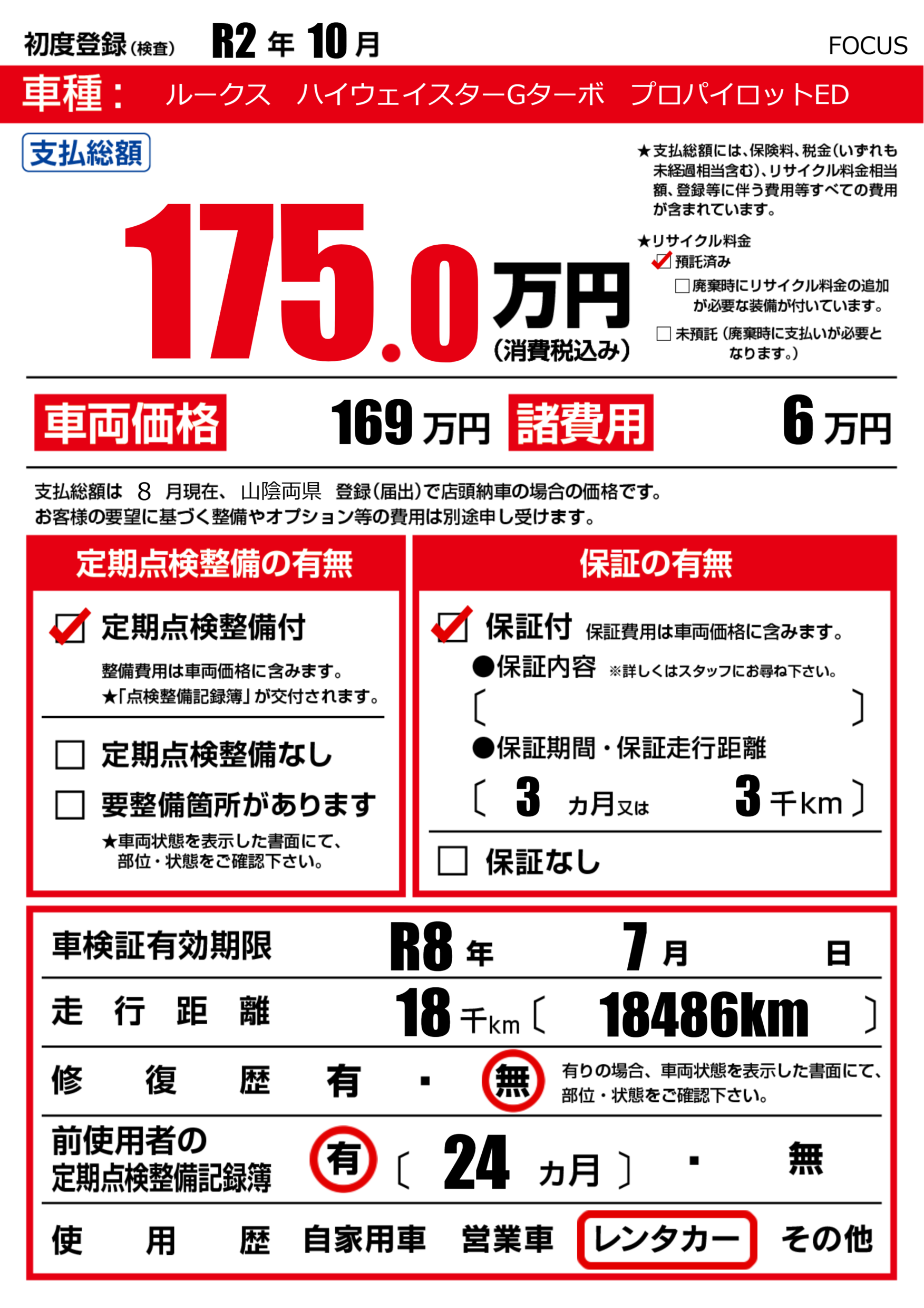 | 走行キロ | 1.8万km | 初年度登録 | R2年10月 |