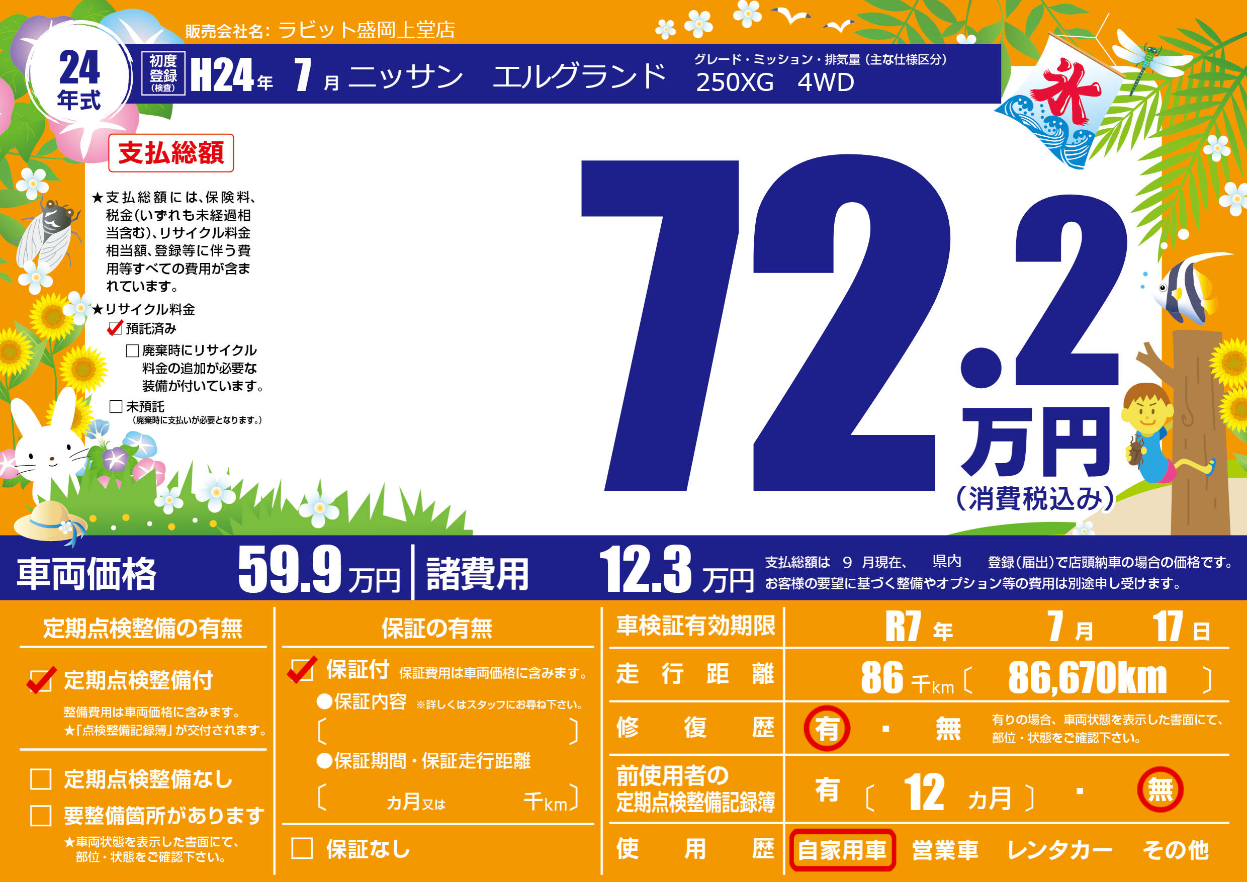 | 走行キロ | 8.6万km | 初年度登録 | H24年7月 |