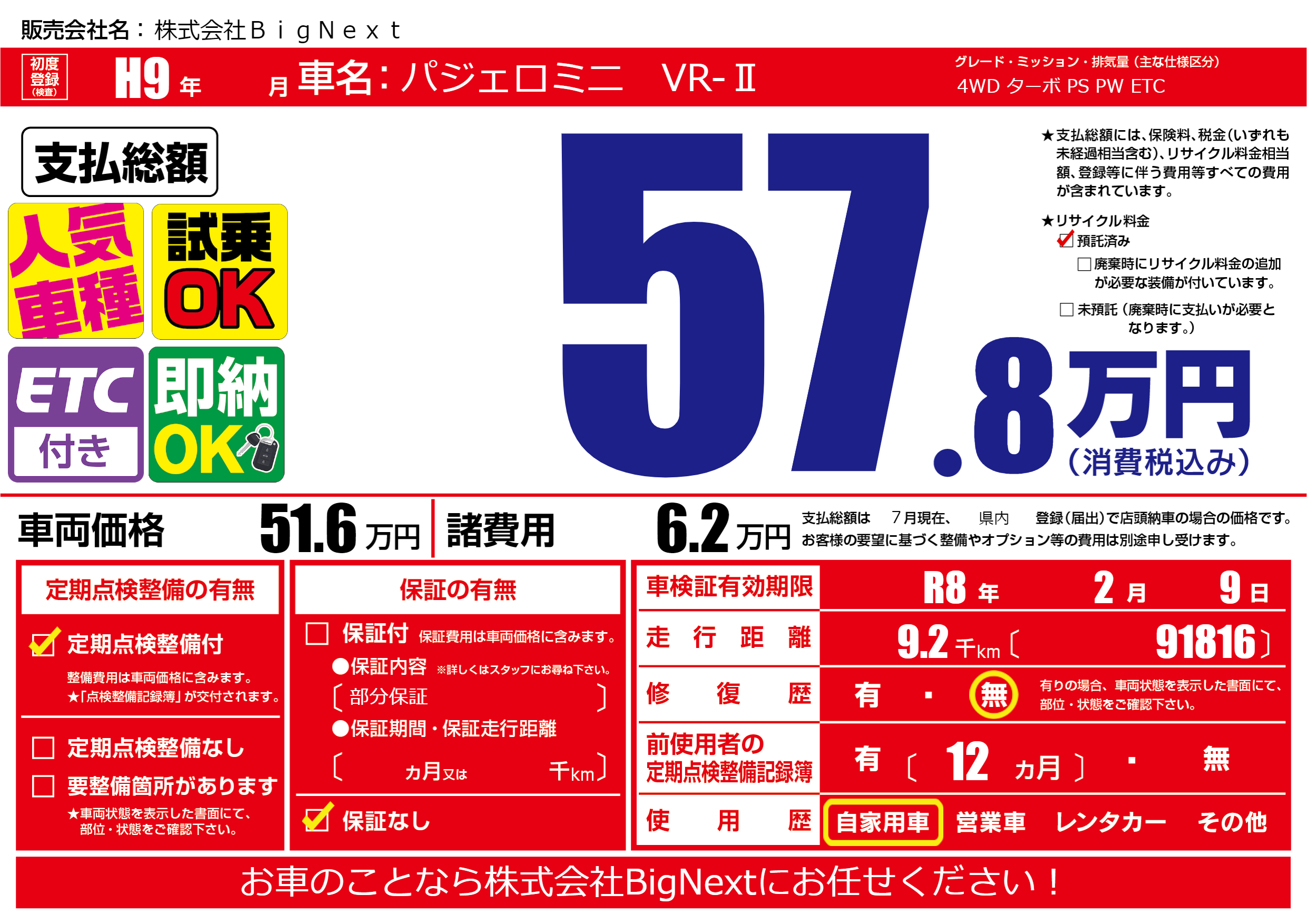 なし | 車検制限 | R8年2月9月 |