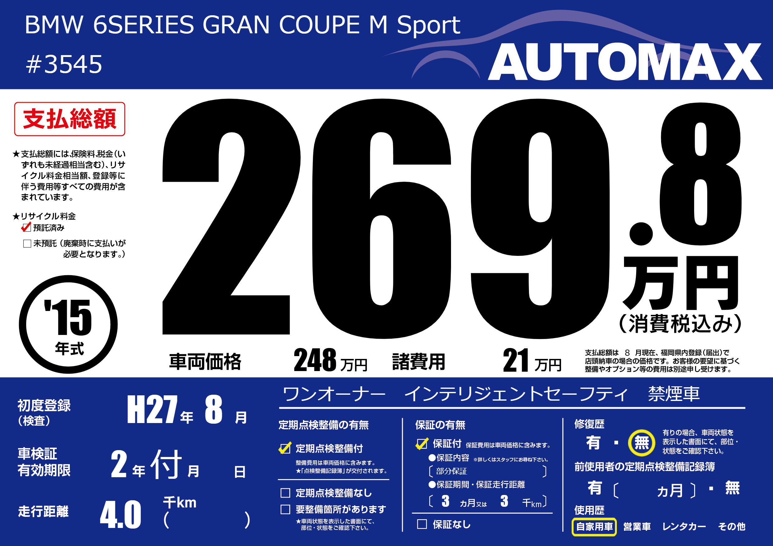 | 車名 | BMW 6SERIES GRAN COUPE M Sport | グレード ミッション 排気量 |