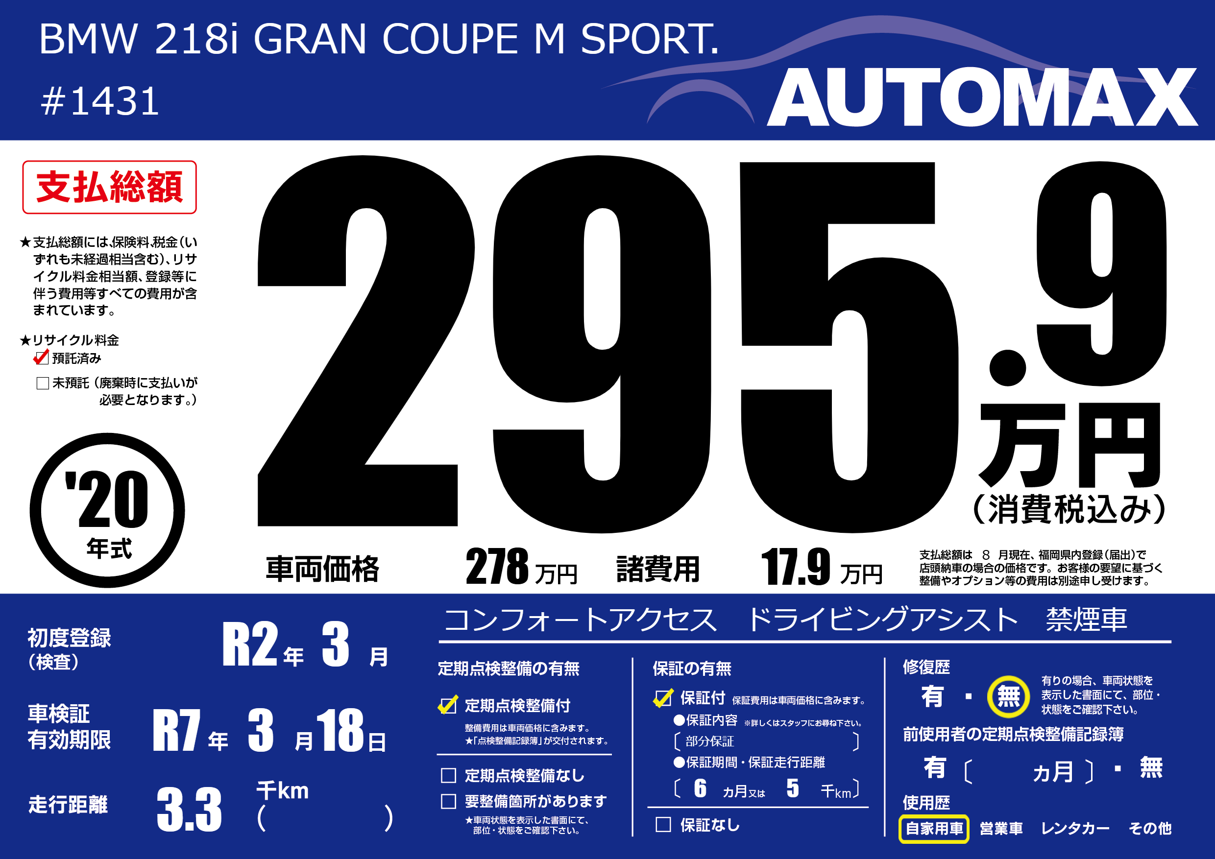 | 車名 | BMW 218i GRAN COUPE M SPORT. | グレード ミッション 排気量 |