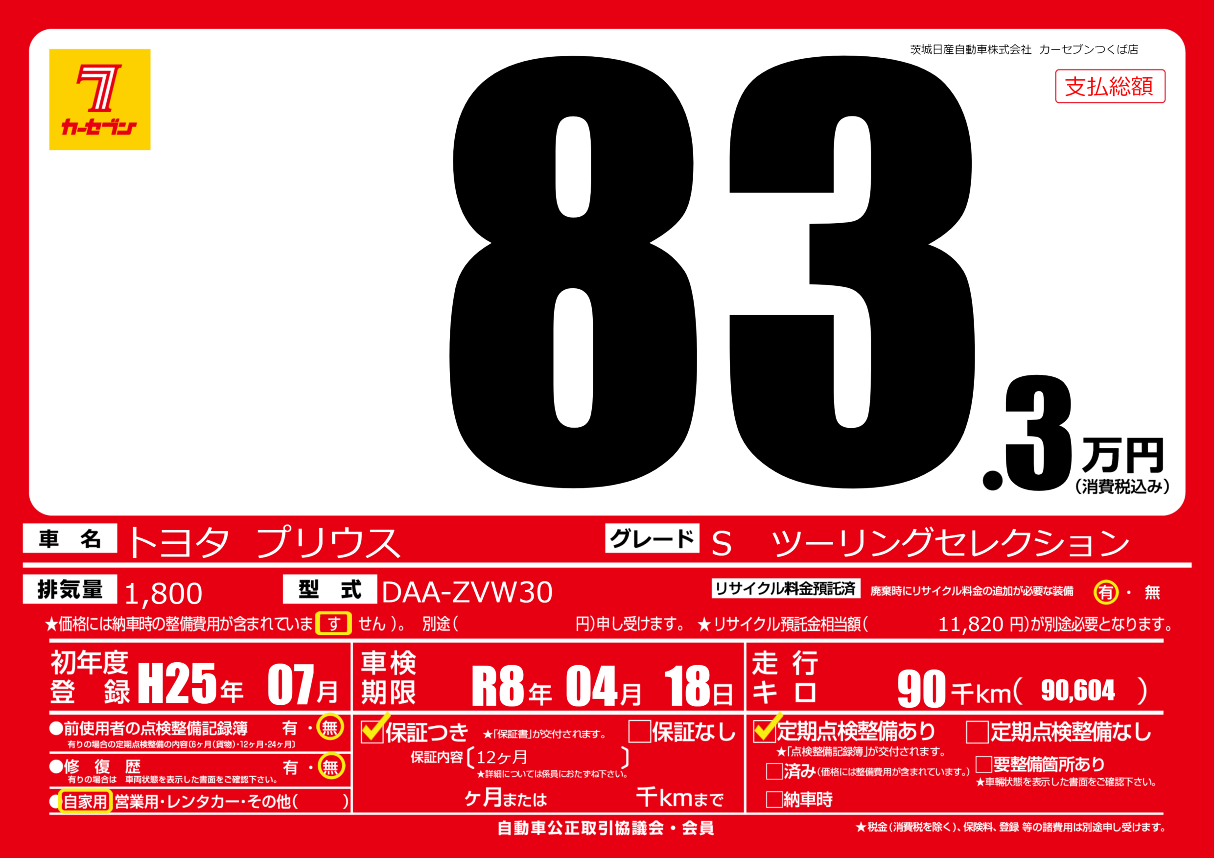 | 車名 | トヨタ プリウス | グレード ミッション 排気量 |