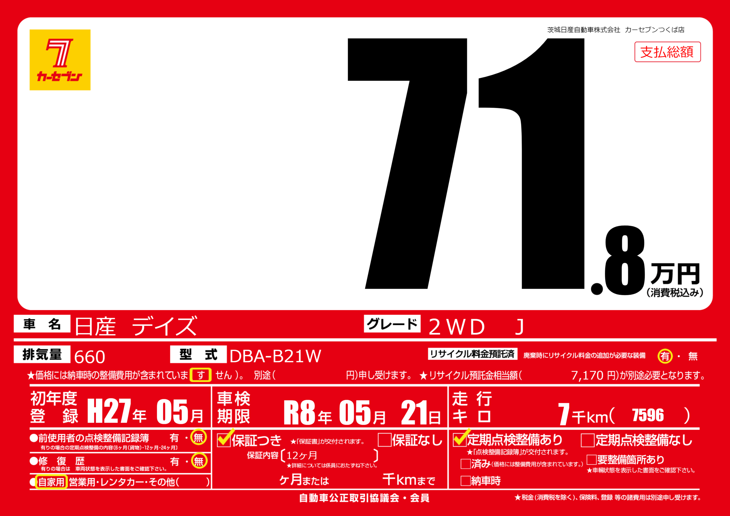 | 車名 | 日産 デイズ | グレード ミッション 排気量 |