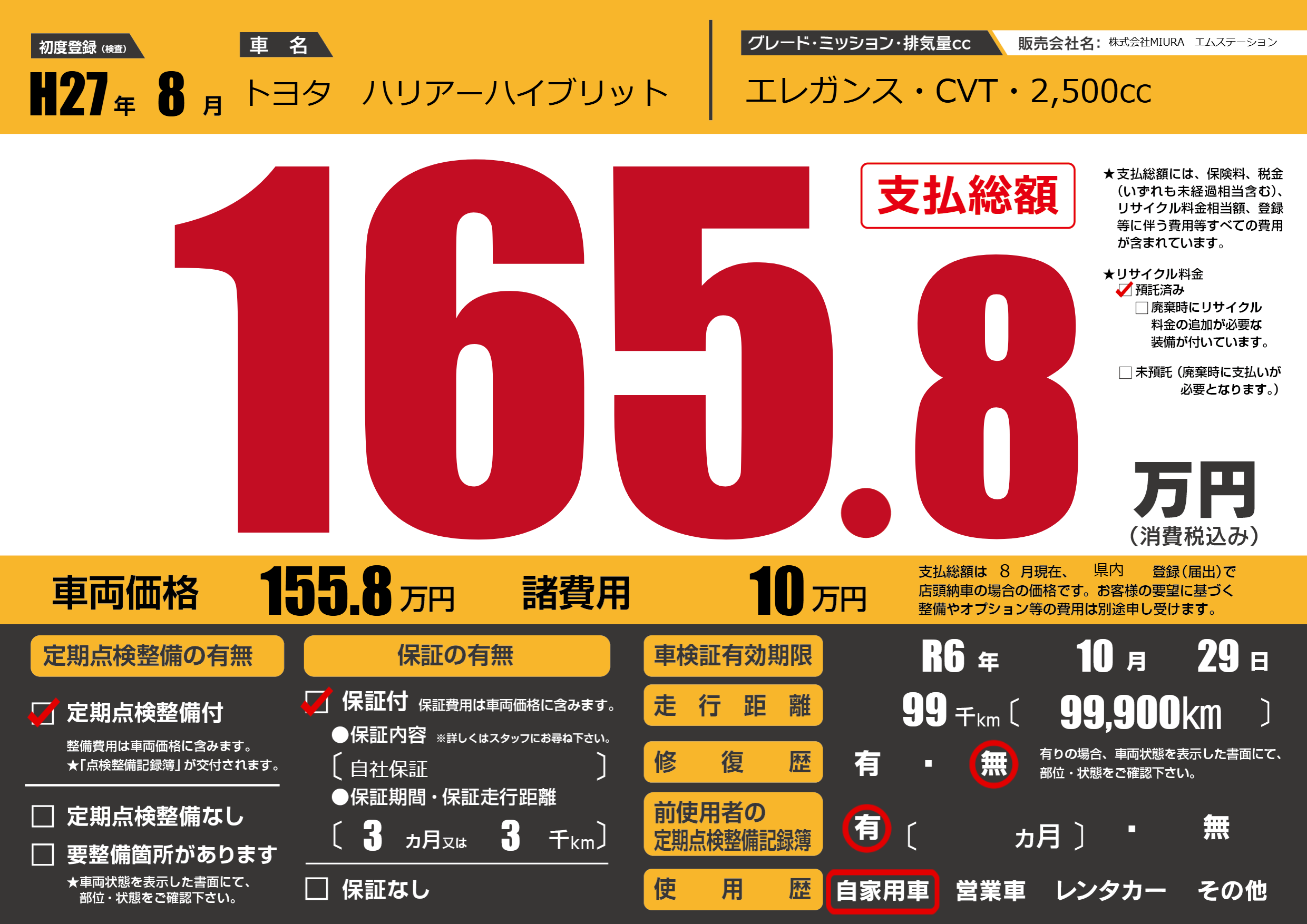 | 走行キロ | 9.9万km | 初年度登録 | H27年8月 |