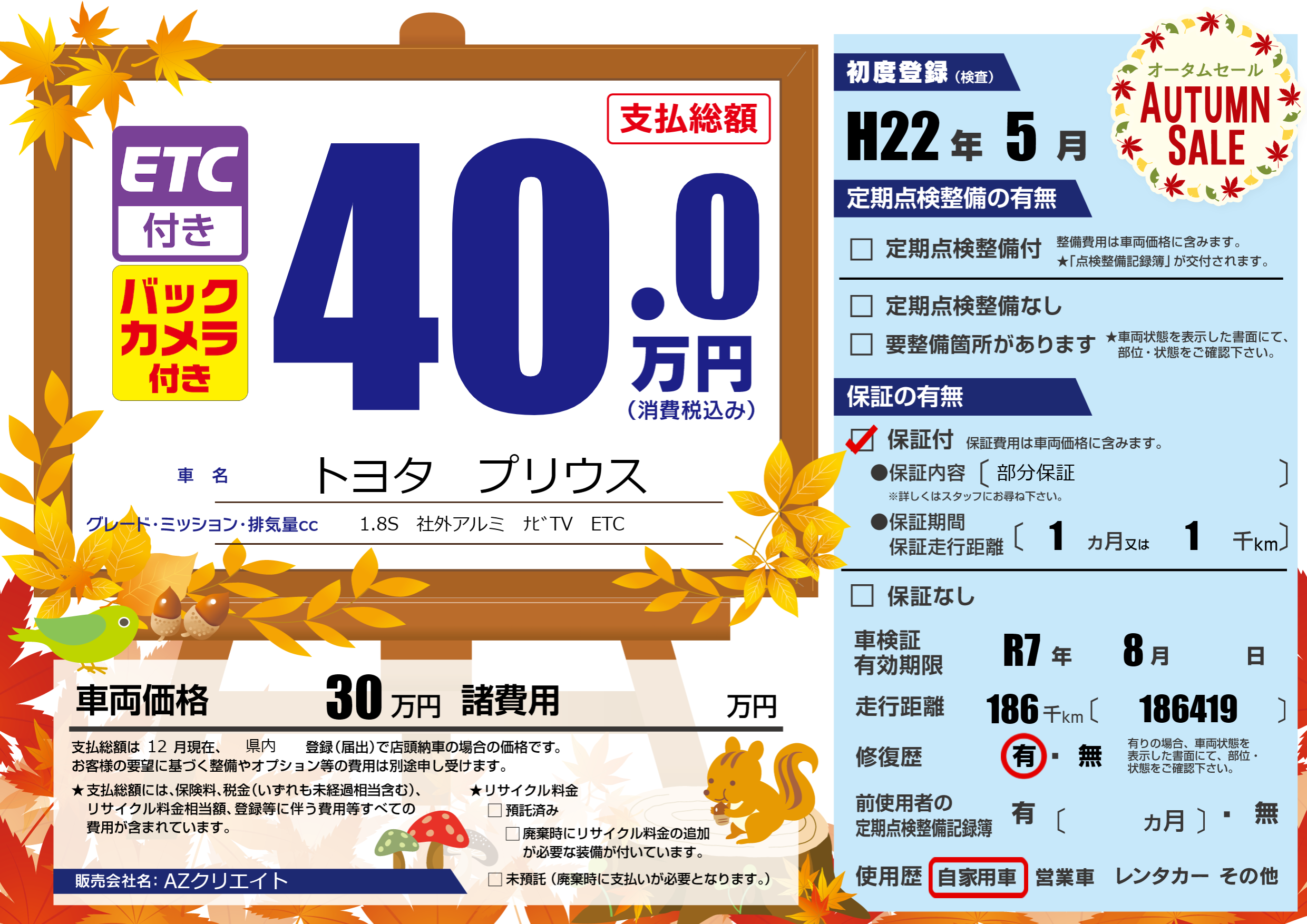 | 車検制限 | R7年 8月 - 日 | ||