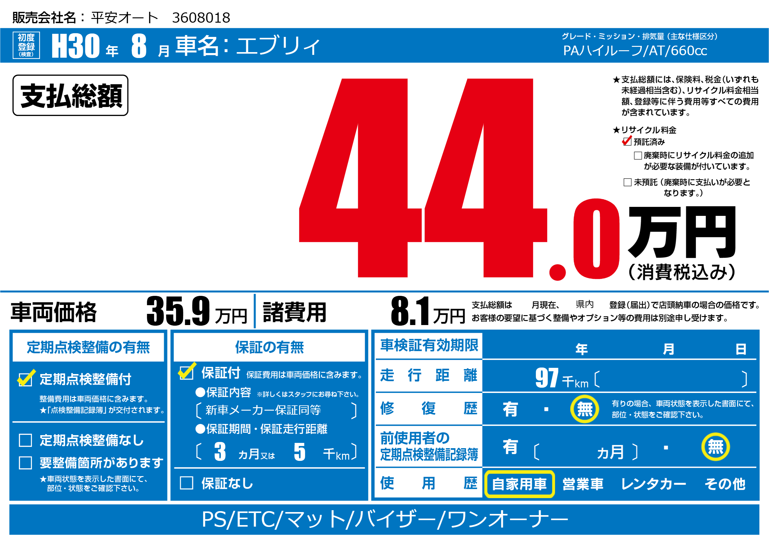 | 車名 | エブリィ | グレード ミッション 排気量 |