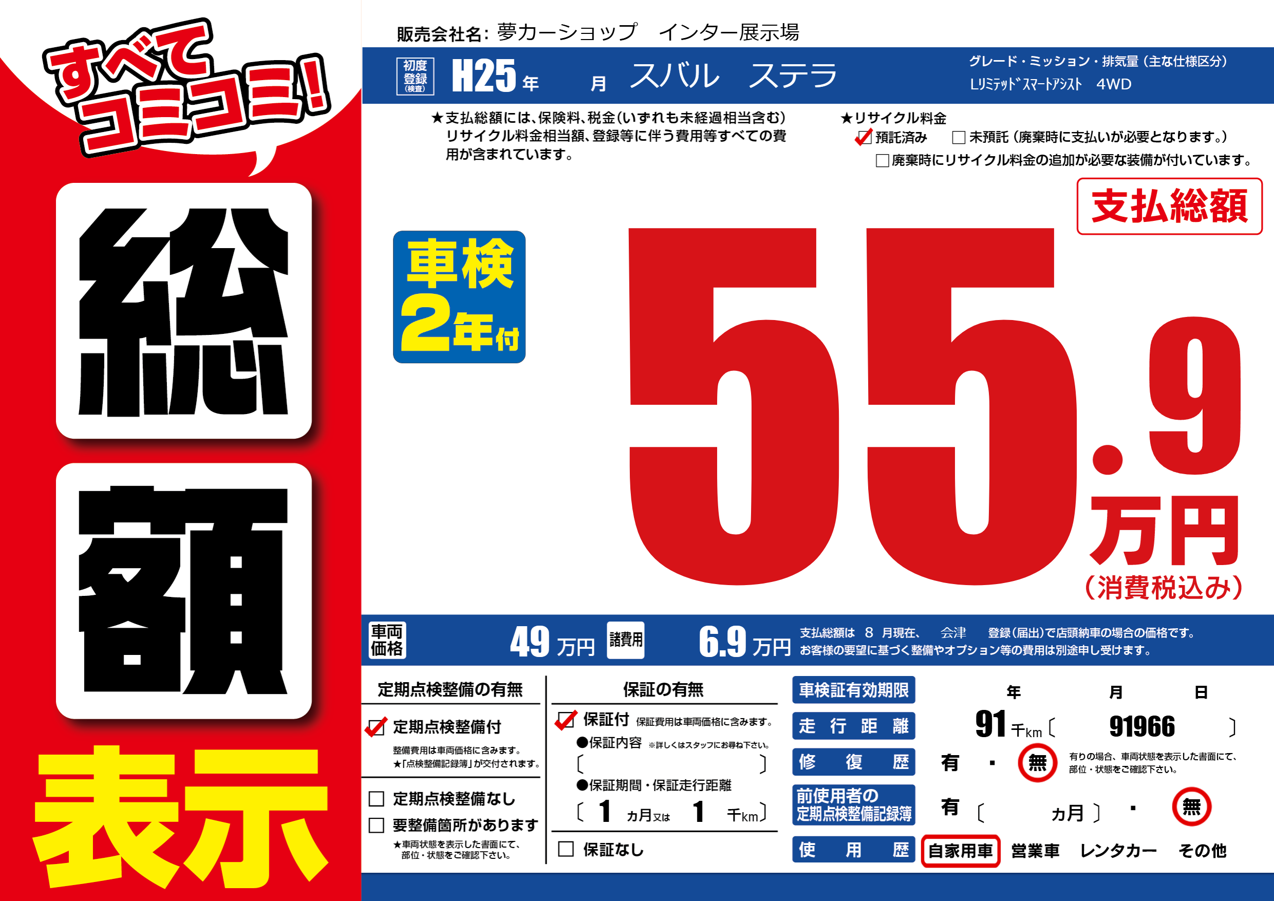 | 車名 | スバル ステラ | グレード ミッション 排気量 |