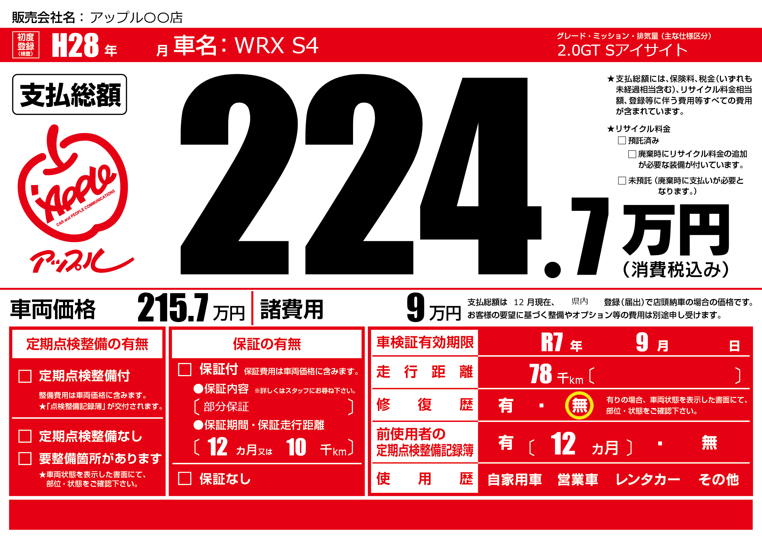 | 車名 | WRX S4 | グレード ミッション 排気量 |