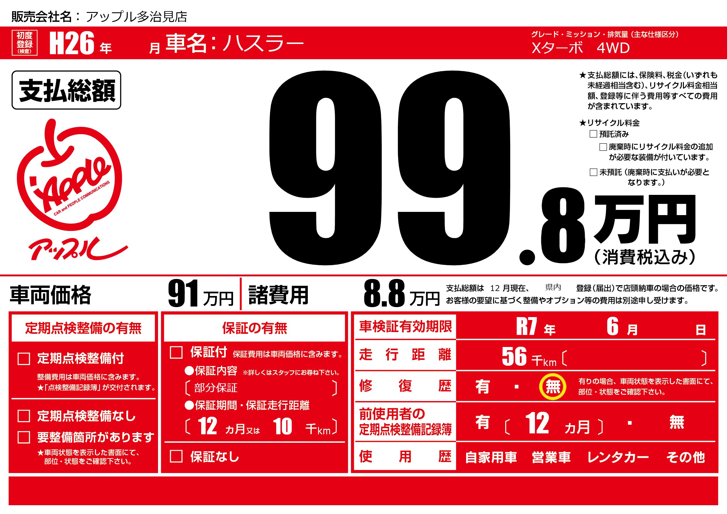 | 車検制限 | R7年 6月 - 日 | ||