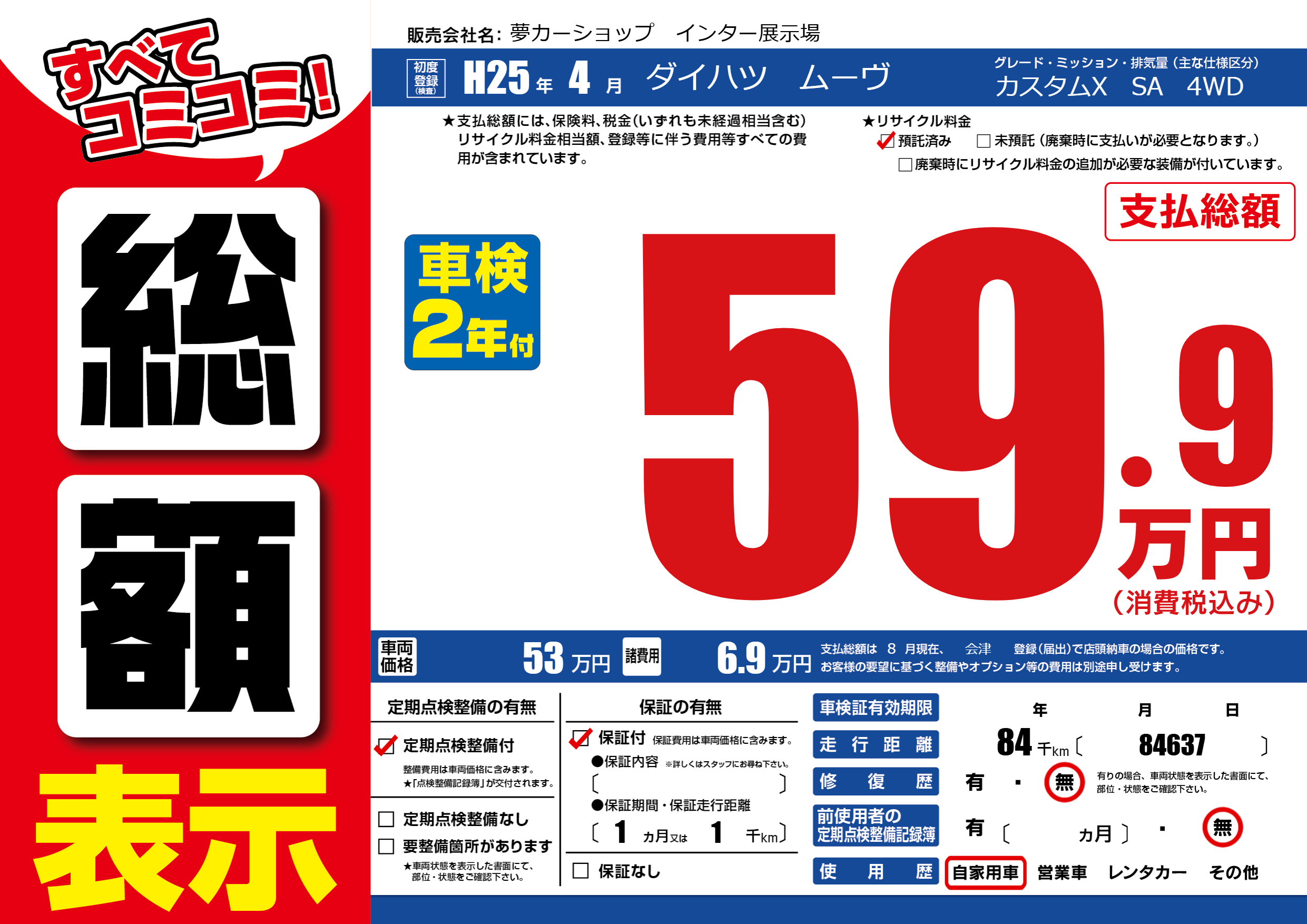 | 走行キロ | 8.4万km | 初年度登録 | H25年4月 |