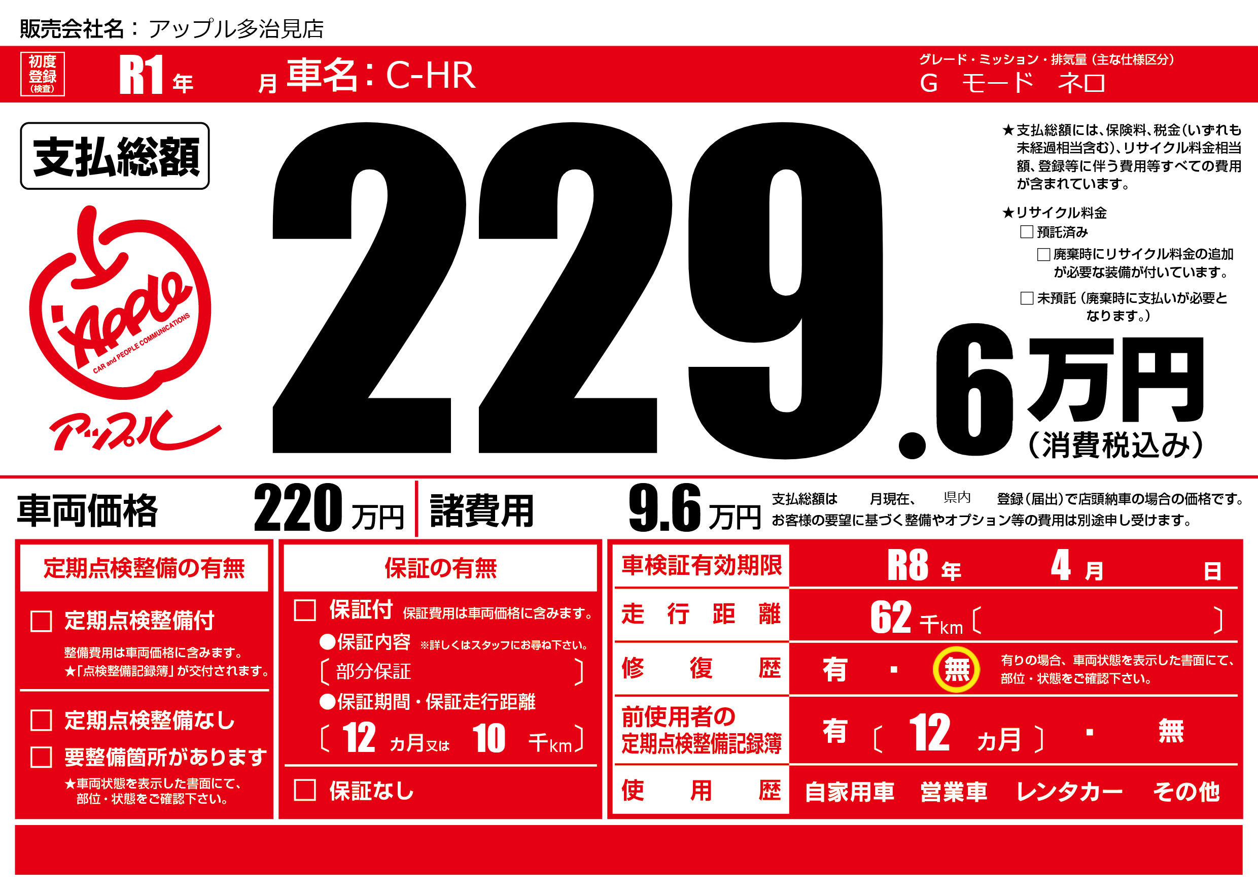 | 車名 | C-HR | グレード ミッション 排気量 |