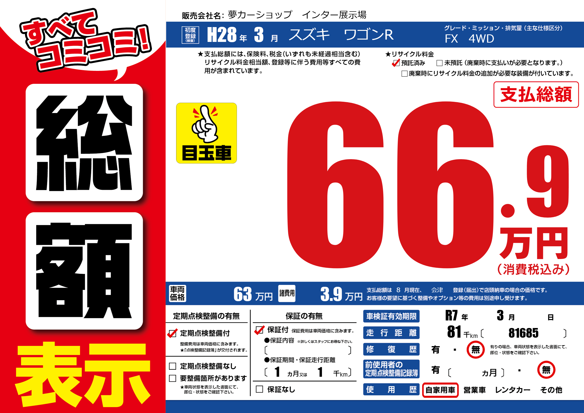 | 車検制限 | R7年 3月 - 日 | ||