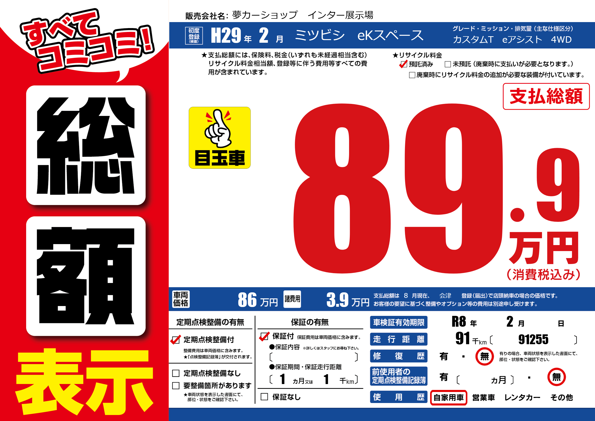 | 走行キロ | 9.1万km | 初年度登録 | H29年2月 |