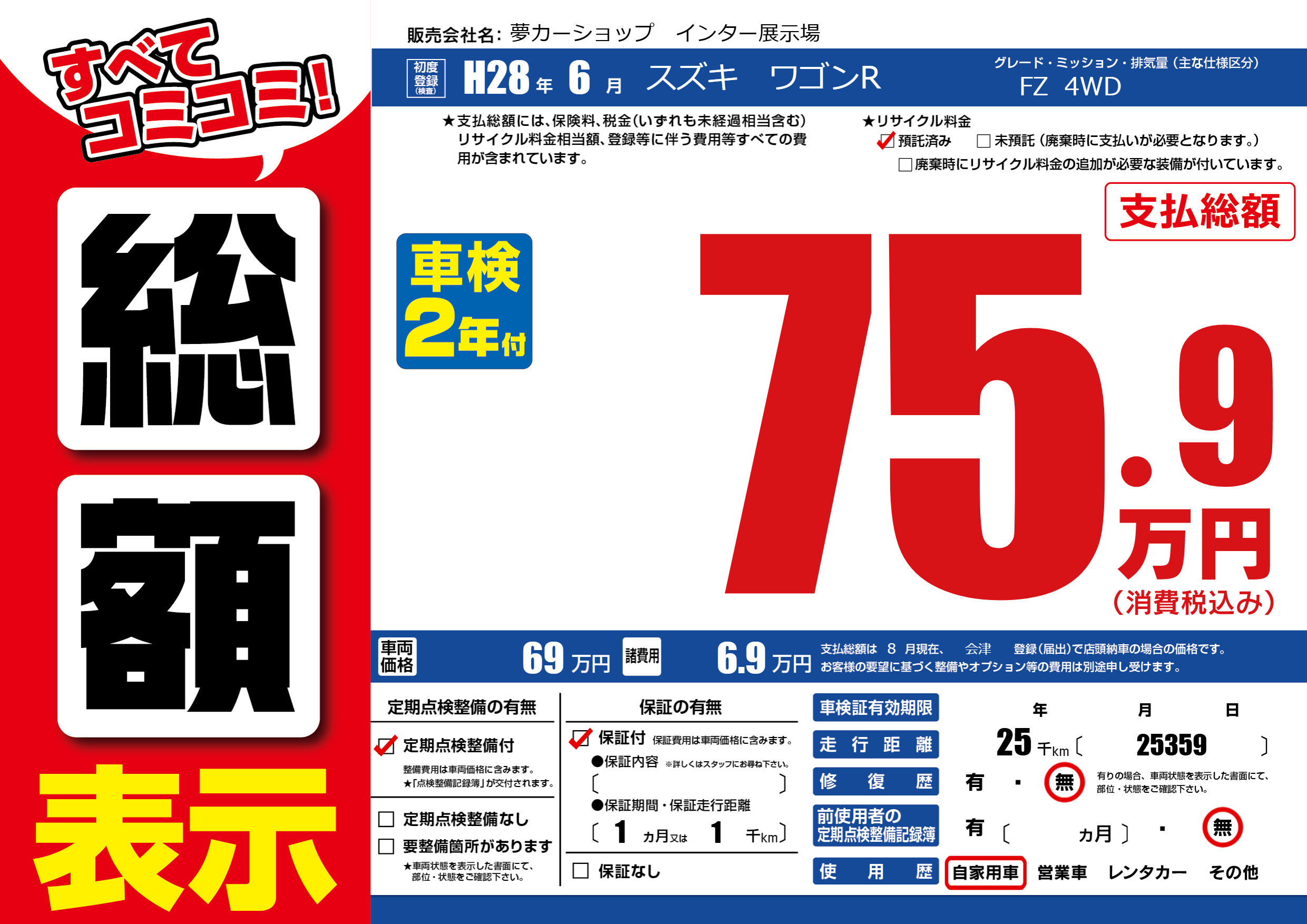| 車名 | スズキ ワゴンR | グレード ミッション 排気量 |