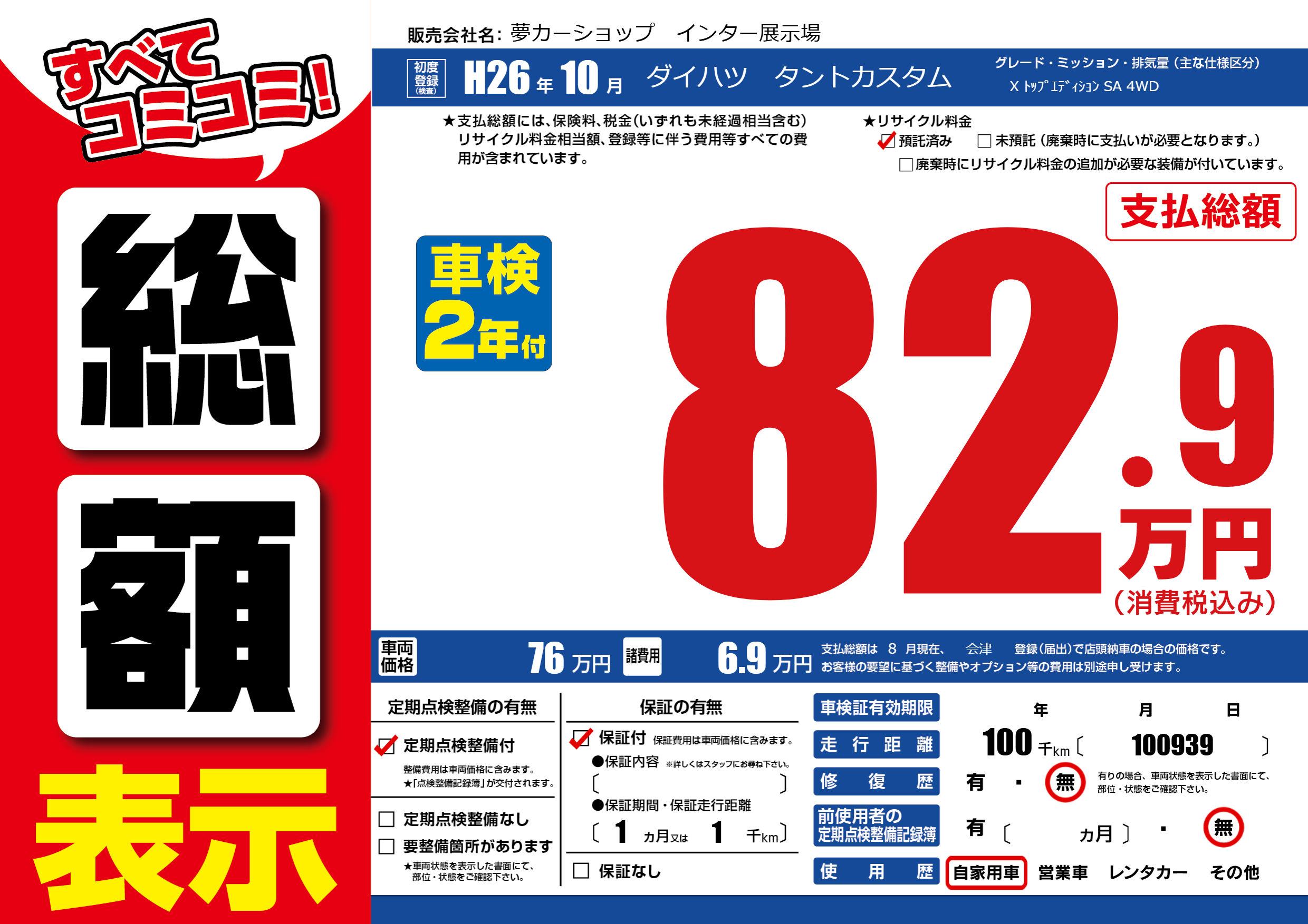 | 走行キロ | 10万km | 初年度登録 | H26年10月 |