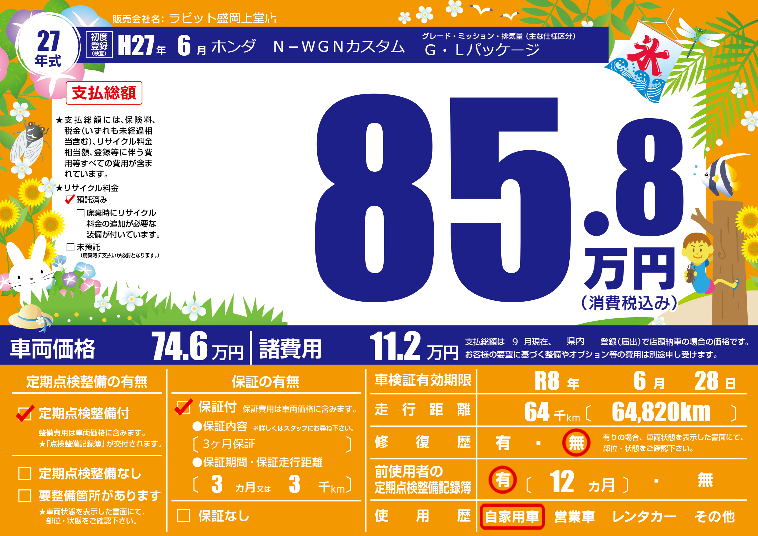 | 走行キロ | 6.4万km | 初年度登録 | H27年6月 |
