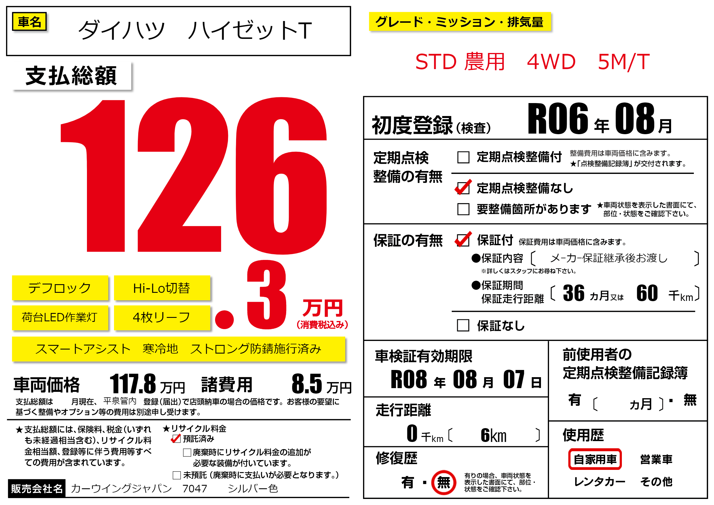 | 車名 | ダイハツ ハイゼットT | グレード ミッション 排気量 |