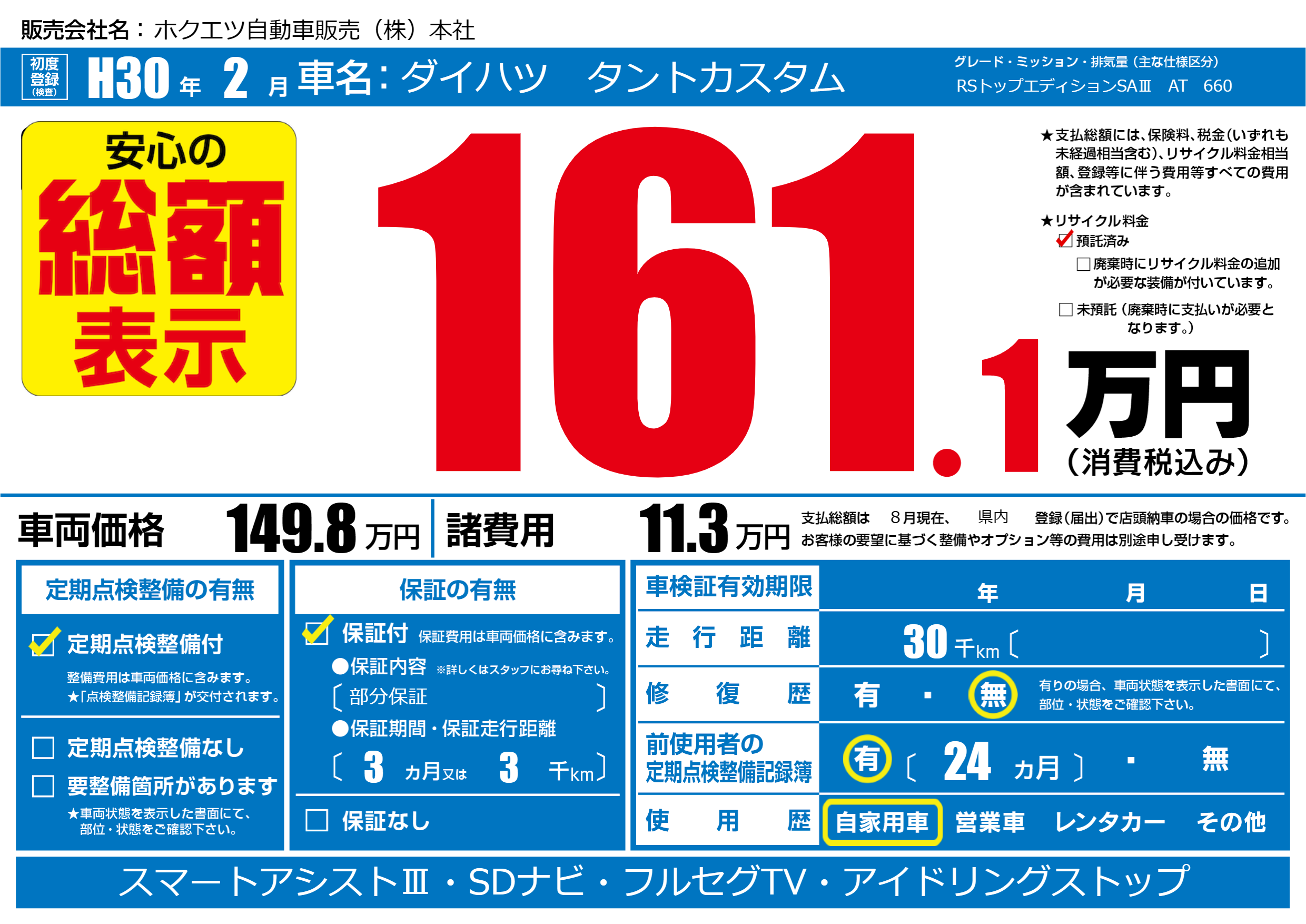 保証付き 保証内容(部分保証) 3ヶ月または(3)千kmまで |