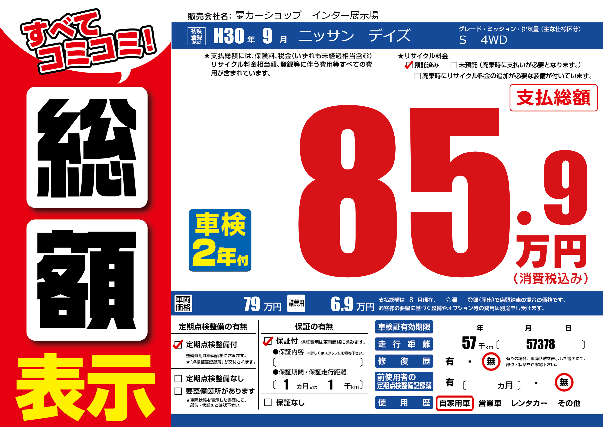| 車名 | ニッサン デイズ | グレード ミッション 排気量 |