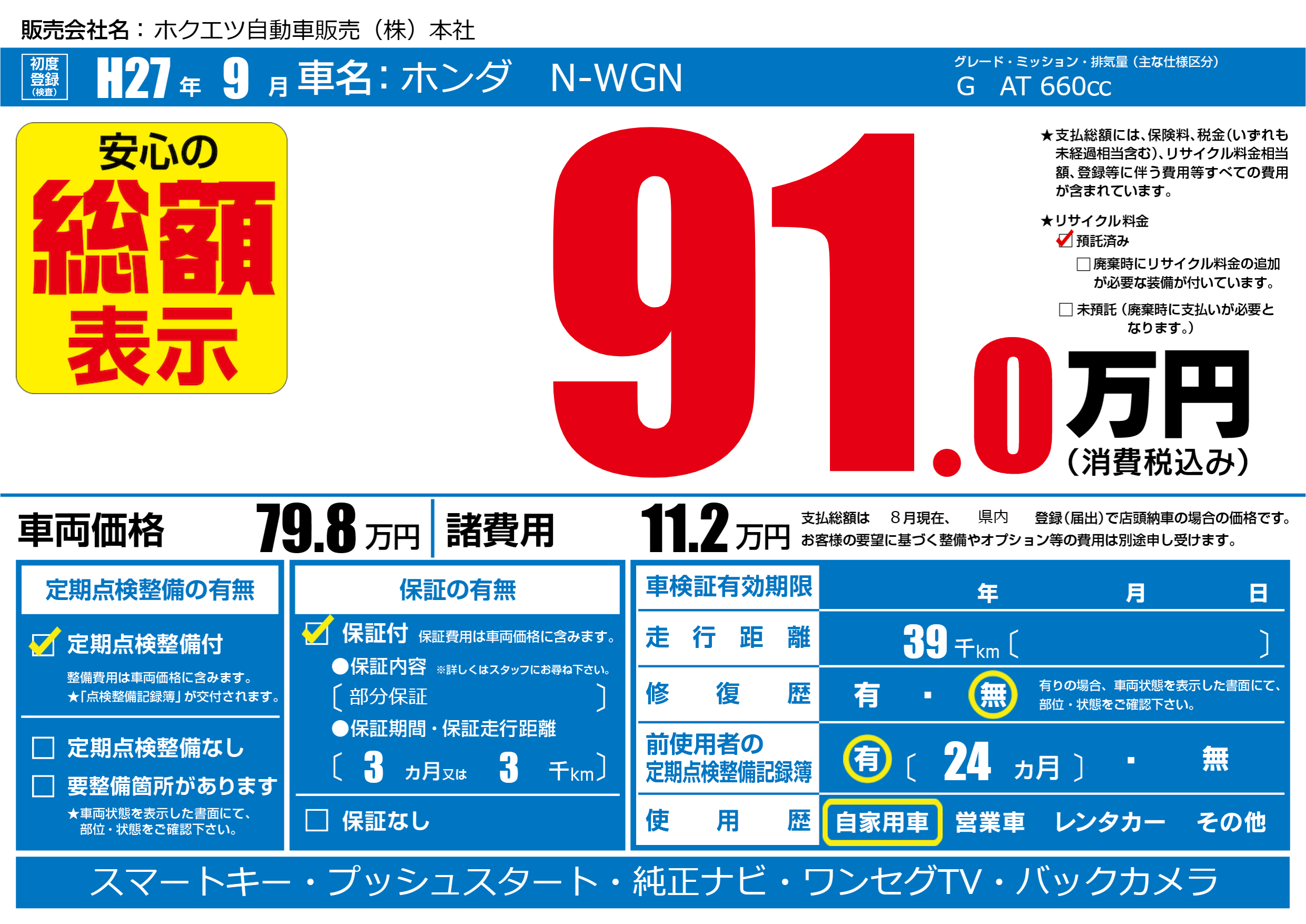 | 車名 | ホンダ N-WGN | グレード ミッション 排気量 |