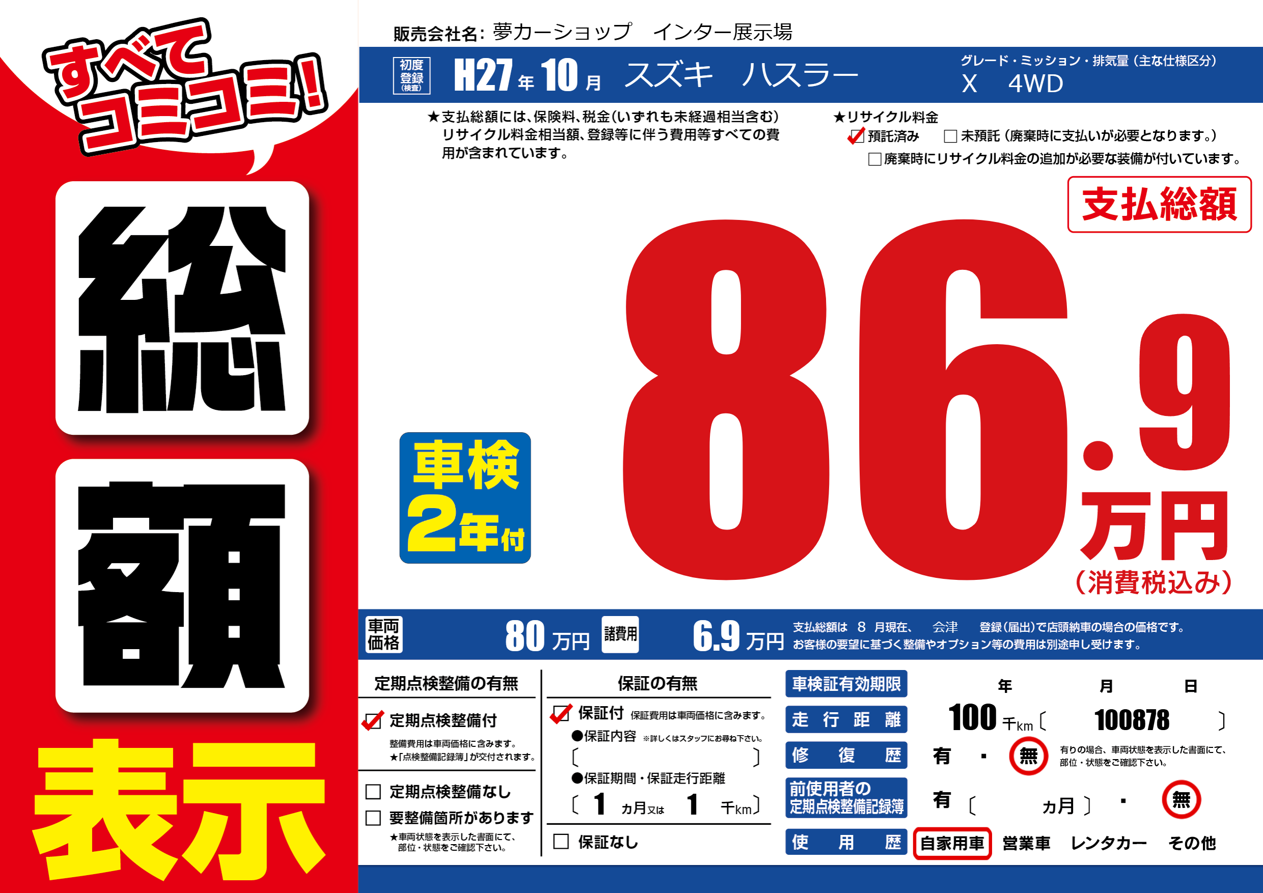 | 走行キロ | 10万km | 初年度登録 | H27年10月 |