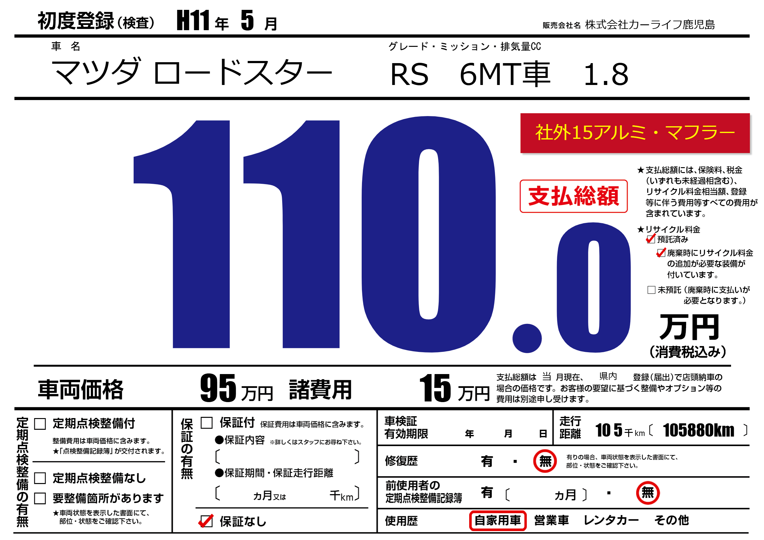 | 走行キロ | 1万km | 初年度登録 | H11年5月 |