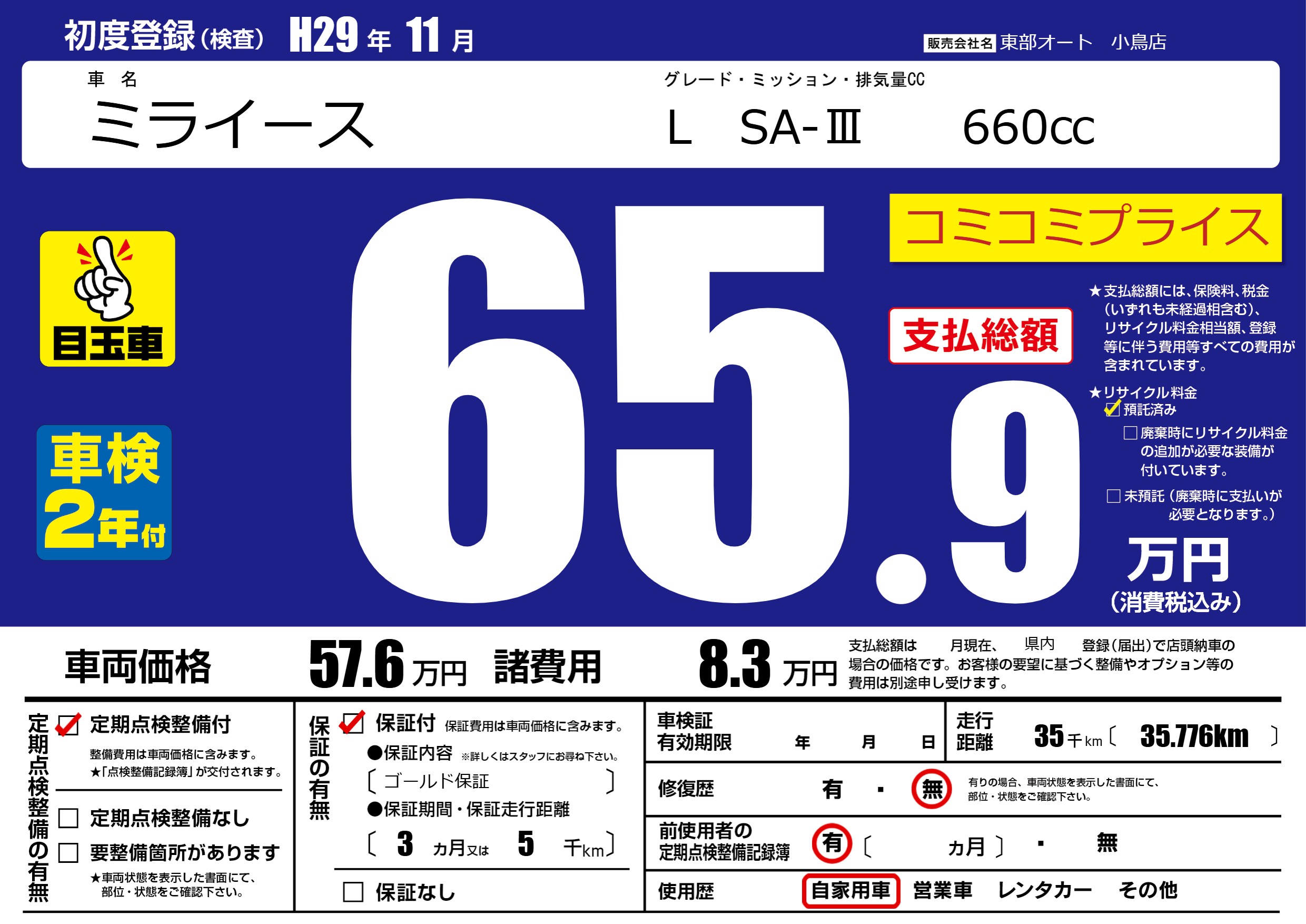| 走行キロ | 3.5万km | 初年度登録 | H29年11月 |