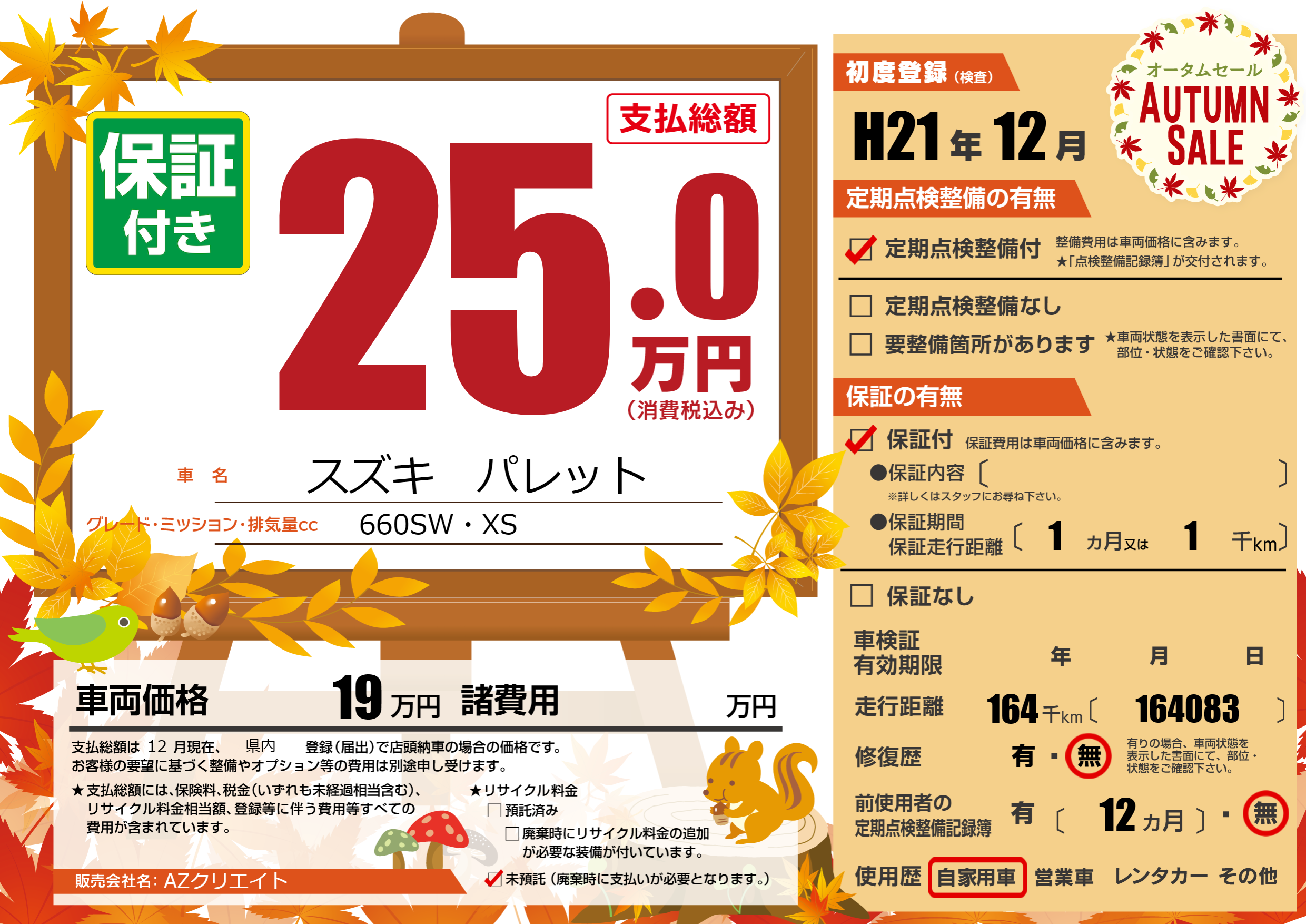 | 車名 | スズキ パレット | グレード ミッション 排気量 |