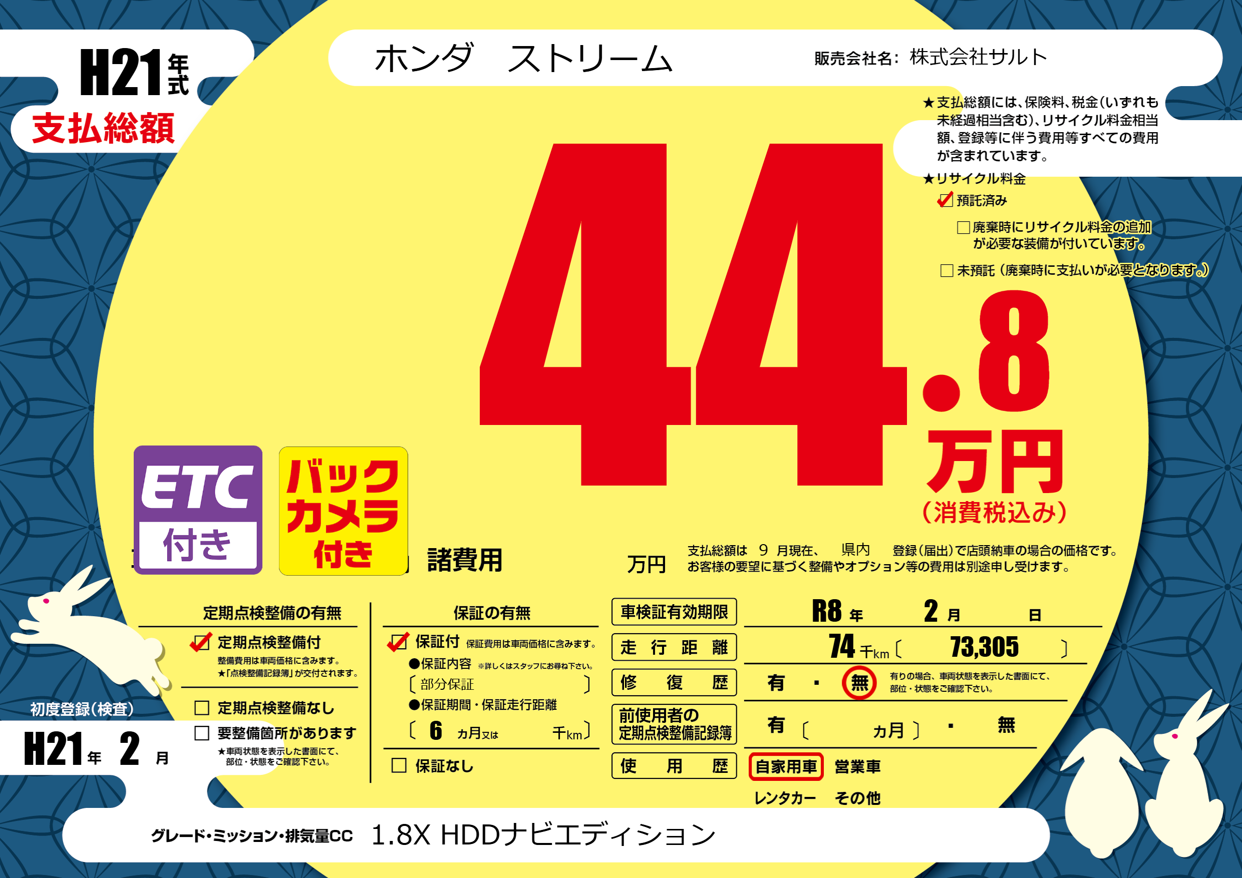 | 車検制限 | R8年 2月 - 日 | ||
