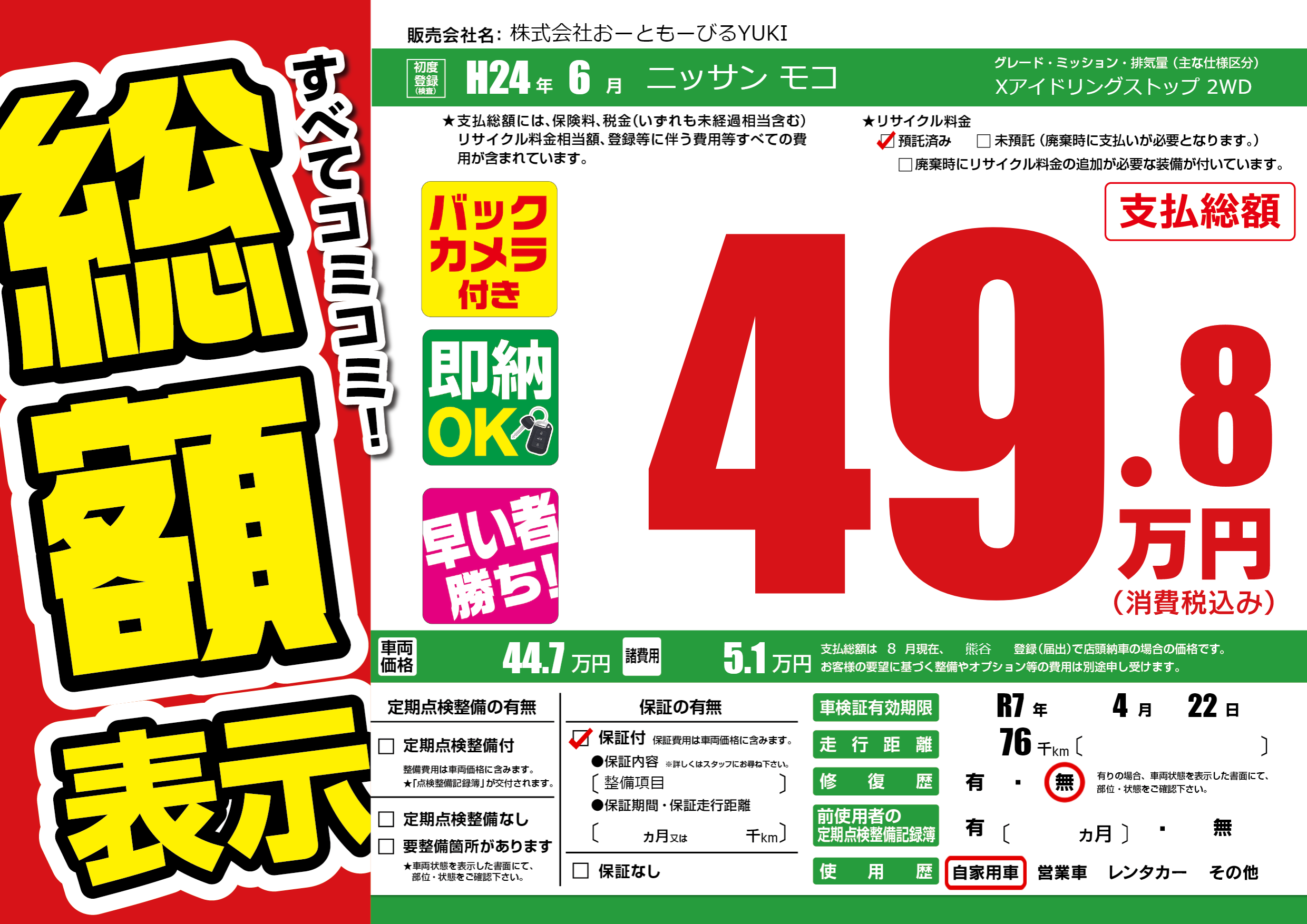 | 車名 | ニッサン モコ | グレード ミッション 排気量 |