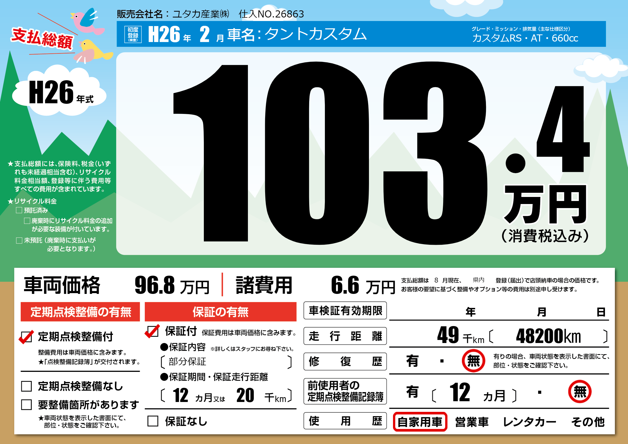 | 車名 | タントカスタム | グレード ミッション 排気量 |