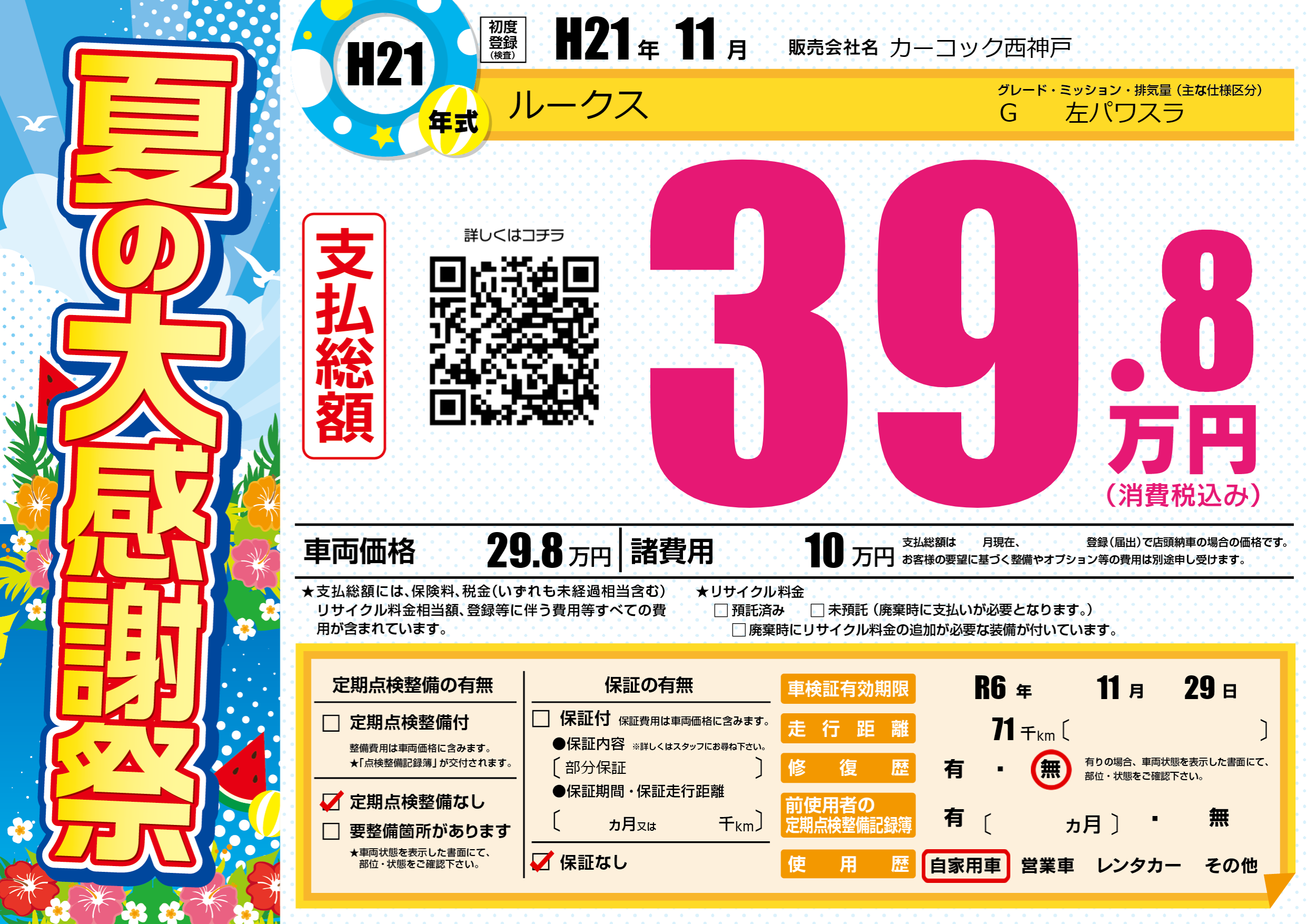 | 走行キロ | 7.1万km | 初年度登録 | H21年11月 |