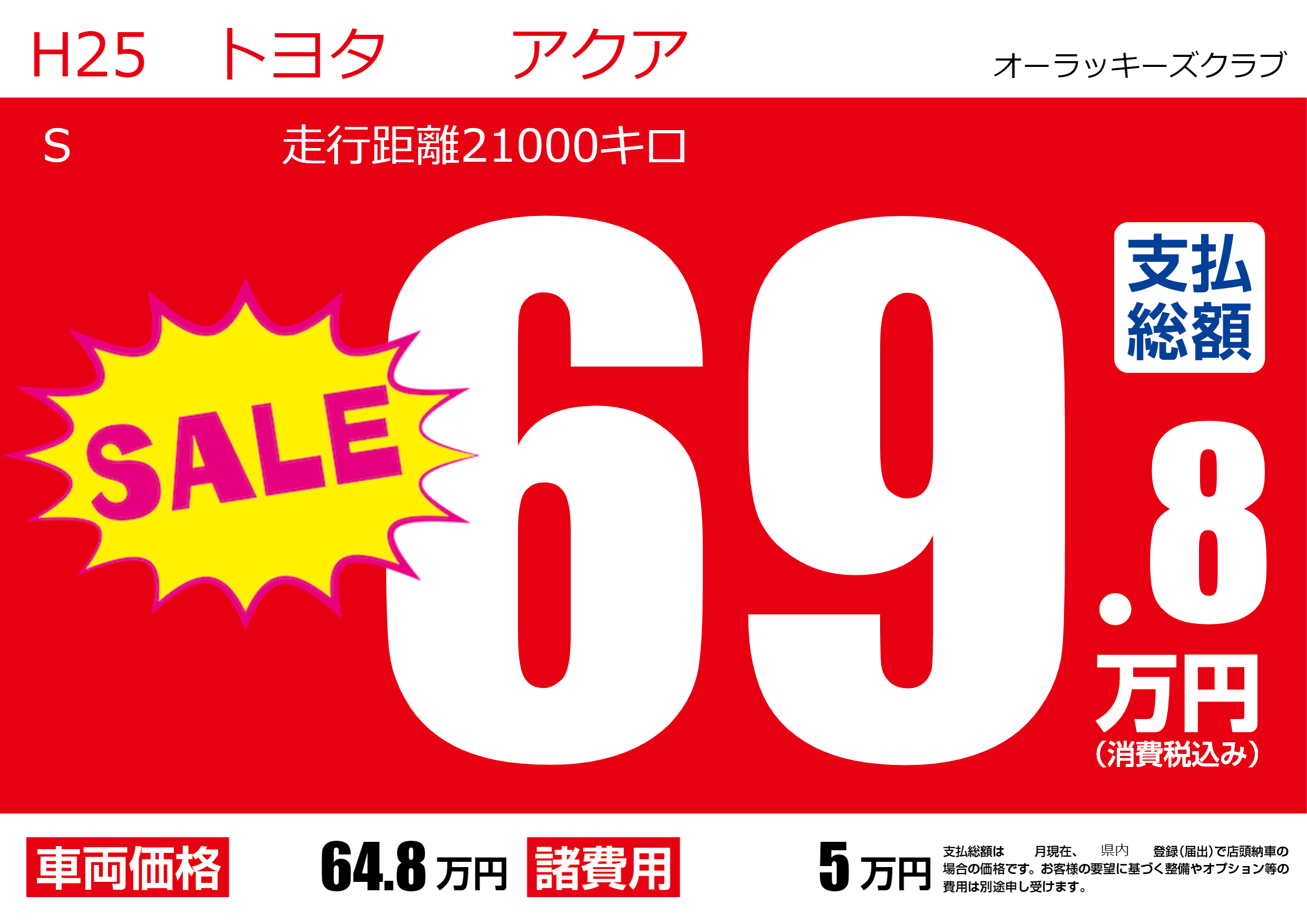 | 車名 | H25 トヨタ アクア | グレード ミッション 排気量 |